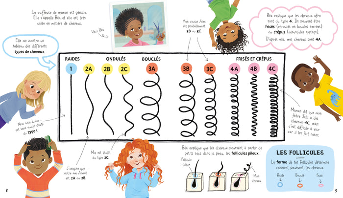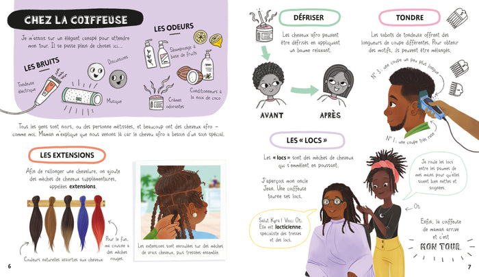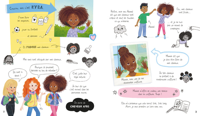 Ce livre illustré raconte l'histoire de Kyra, une jeune fille afro, qui apprend à aimer ses cheveux et sa propre identité. Après une visite chez le coiffeur, ses camarades de classe posent des questions sur ses cheveux. Kyra partage alors ses connaissances sur les différents types de cheveux, les coiffures traditionnelles et l'importance de l'acceptation de soi. Ce livre, écrit en collaboration avec des organisations luttant contre la discrimination capillaire et le racisme, encourage les enfants à être fiers de leur apparence et à respecter les différences. Afficher moinsAfficher plus