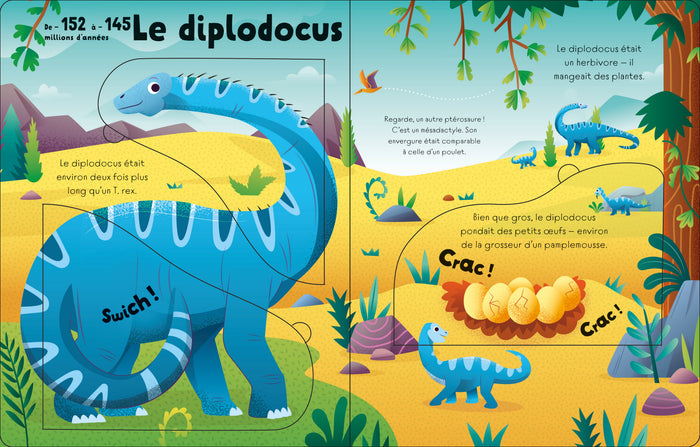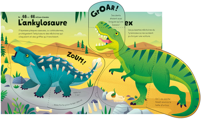 PrésentationUn livre cartonné avec de très grands rabats à soulever pour découvrir des dinosaures tous plus grands les uns que les autres. En soulevant les grands rabats solides de ce livre cartonné, les tout-petits découvriront de gigantesques dinosaures. Ils pourront observer un combat entre un t-rex et un ankylosaure, voir les os d'un stégosaure géant, découvrir la taille du plus grand ptérosaure, et bien plus encore. Chaque page de ce livre à rabats rassemble tout un tas de faits étonnants ainsi qu'un guide de prononciation. Un cadeau parfait pour les fans de dinosaures ! dès 3 ans Afficher moinsAfficher plus
