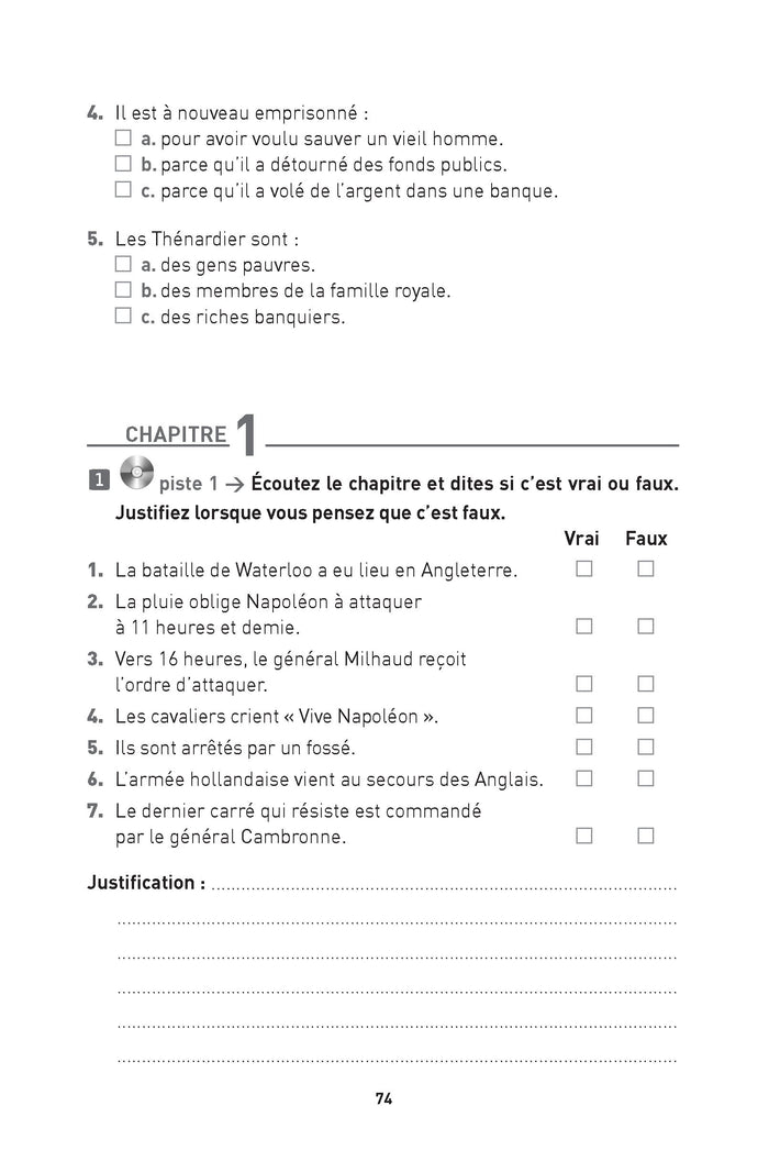 Présentation Une seule collection de lecture pour tous niveaux ! Structure du livre : Une collection de lecture en français pour se divertir, s'enrichir, perfectionner ses connaissances des grands classiques de la littérature française.Cette collection est accessible dès le niveau débutant, elle est organisée en quatre niveaux : A1, A2, B1, B2.Un dossier pédagogiqueà la fin de l’œuvre est renforcé par des activités de compréhension, des fiches thématiques et des corrigés intégrés.La définition des mots et des expressions difficiles figure en bas de page.  Descriptif : "Marius découvre un jour que le père qu'il n'a jamais connuétait un héros de la Révolution et de l'Empire. Il devient républicain et s'opposeà son grand-pére... On se bat sur les barricades. Cosette, qui est devenue une belle jeune fille, tombe amoureuse mais Jan Valjean veille..." Composants : Livre + version audio contenant l'intégralité du texte avec plus de 3 heures d'écoute  Afficher moinsAfficher plus