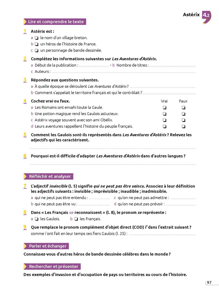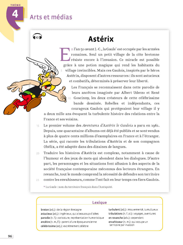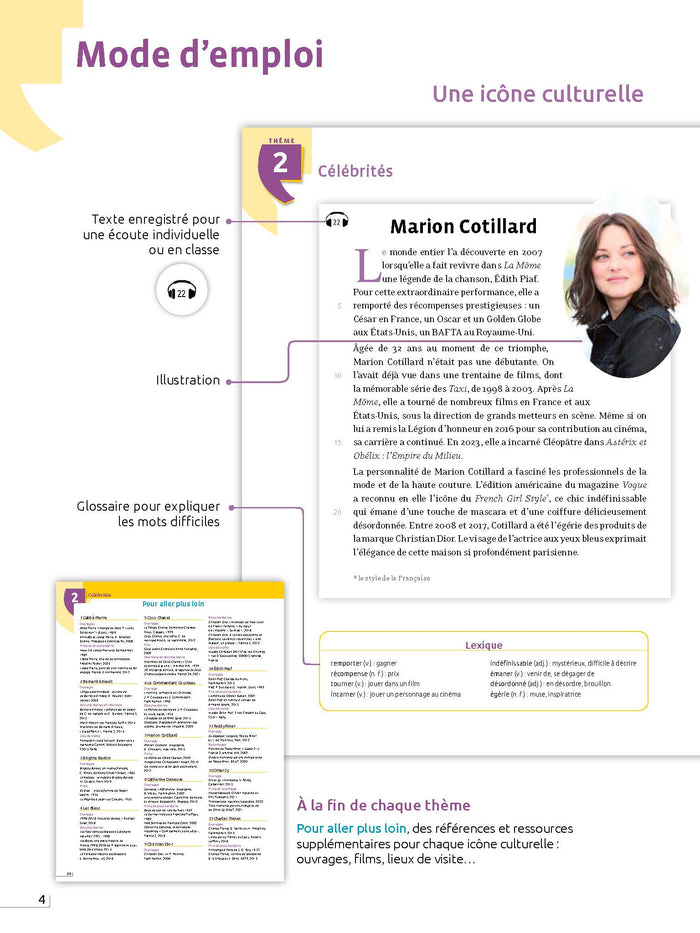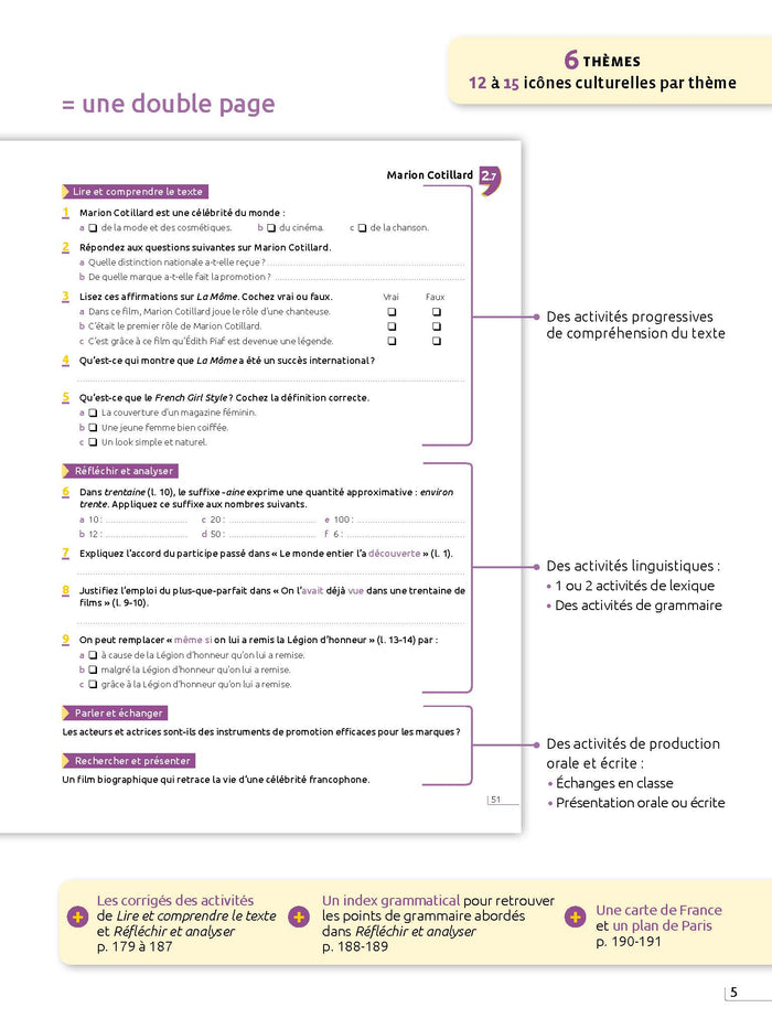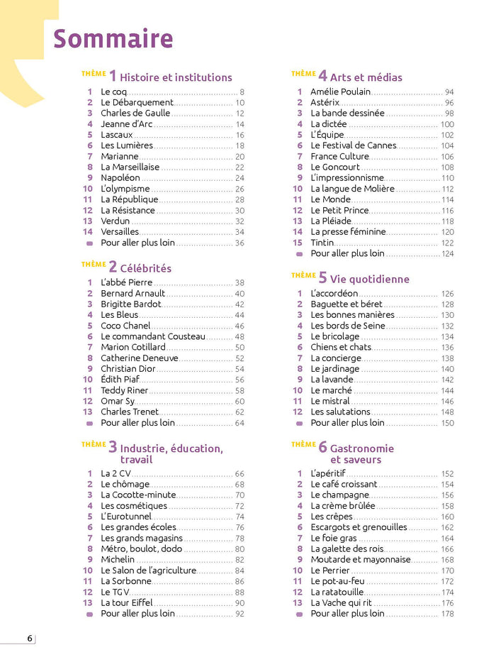Ce manuel pédagogique propose aux apprenants de niveau A2-B1 de découvrir les fondamentaux de la culture française à travers 80 portraits d'objets iconiques. Chaque leçon présente un texte illustré suivi d'activités de compréhension, de repérage linguistique et de production. Des références culturelles supplémentaires et des corrigés sont inclus, ainsi que des versions audio des textes. Afficher moinsAfficher plus