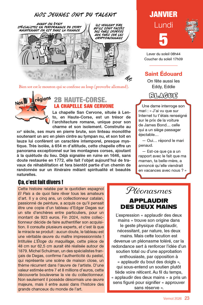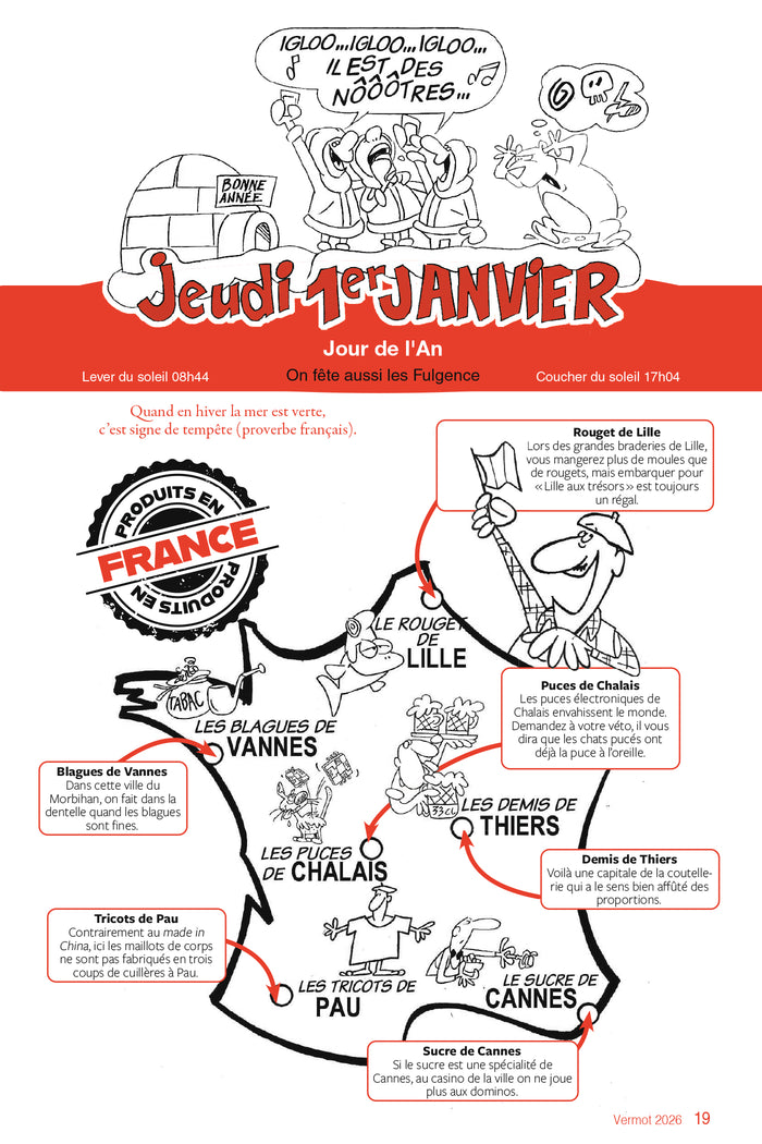 L'Almanach Vermot revient en 2026 avec ses rubriques variées et insolites. Illustré et rédigé par des spécialistes, il propose des contenus divertissants et instructifs sur des sujets tels que les légendes régionales, les cancres célèbres, les pirates, ou encore les longs baisers du cinéma. En plus des jeux, blagues et actualités, cet almanach inclut des rubriques surprenantes comme les cold case de l'histoire de France. Un ouvrage à la fois ludique et culturel, idéal pour toute la famille. Afficher moinsAfficher plus