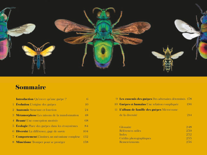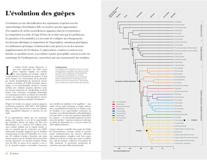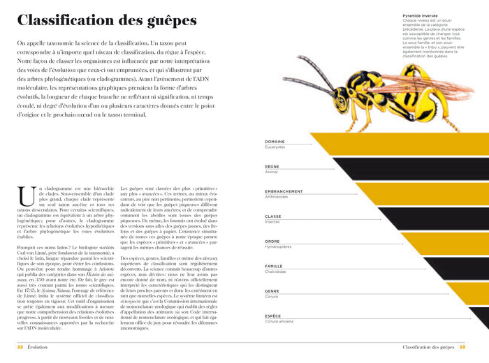PrésentationIl existe plus d’espèces de guêpes que d’abeilles et de frelons, les pique-assiettes et squatteurs de nos maisons. Et non seulement, elles sont plus complexes que leurs cousins, mais en plus, elles sontétonnantes ! Par exemple : bien que souvent solitaires, on trouve des guêpes dans toutes les régions de la planète. D'ailleurs, leur influence sur nos vies est extrêmement bénéfique. Vous en doutez ? Découvrez avec cet ouvrage en quoi les guêpes sont vitales pour l'équilibre de l'écosystème : agents de lutte contre les parasites dans l'agriculture et les jardins, le jour ; elles sont aussi sujets d'étude en médecine, en ingénierie et dans d'autres domaines importants, la nuit. Enfin, quand il leur reste un peu de temps libre, les guêpes pollinisent les fleurs, s'engagent dans des relations symbiotiques avec d'autres organismes et construisent des chefs-d'oeuvre architecturaux qui leur servent de nid. Retrouvez dans ce livre richement illustré quelques-uns des membres les plus spectaculaires du royaume des guêpes, ces insectes haut en couleurs tant par leur apparence que par leur comportement. • Plus de 150 illustrations aux couleurs incroyables • Une multitude d’infographiesépoustouflantes. • Des informations complètes sur la plupart des familles de guêpes • La description des espèces de guêpes des quatre coins du monde. • L’évolution, l’écologie, la physiologie, la diversité et le comportement des guêpes. • L’influence très bénéfique des guêpes sur l’écosystème et la vie humaine. Afficher moinsAfficher plus