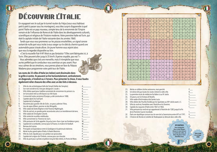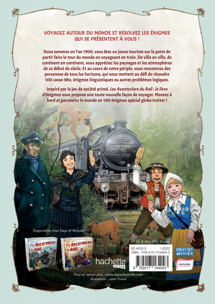 PrésentationVOYAGEZ AUTOUR DU MONDE ET RÉSOLVEZ LESÉNIGMES QUI SE PRÉSENTENTÀ VOUS ! Nous sommes en l’an 1900, vousêtes un jeune touriste sur le point de partir faire le tour du monde en voyageant en train. De ville en ville, de continent en continent, vous appréciez les paysages et les atmosphères de ce début de siècle. Et au cours de votre périple, vous rencontrez des personnes de tous les horizons, qui vous mettent au défi de résoudre 100 casse-tête,énigmes linguistiques ou autres problèmes logiques. Inspiré par le jeu de société primé,Les Aventuriers du Rail : le livre d’énigmesvous propose une toute nouvelle façon de voyager. Montezà bord et parcourez le monde en 100énigmes spécial globe-trotter !   Afficher moinsAfficher plus