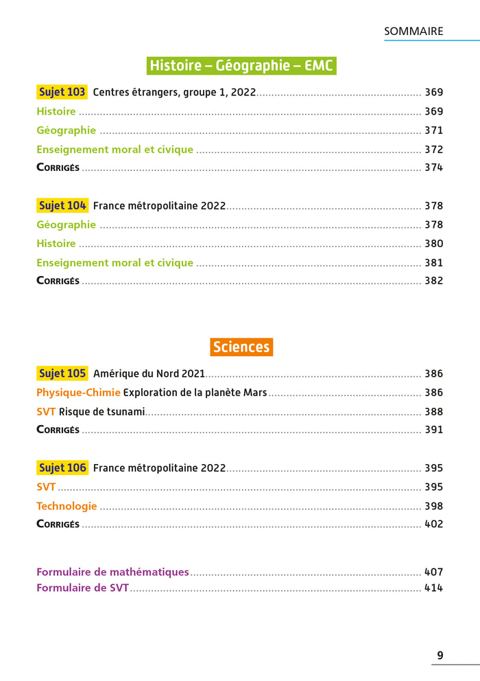 Ce manuel regroupe l'ensemble des matières du Brevet des Collèges (français, histoire-géographie EMC, maths, physique-chimie, SVT, technologie) en un seul ouvrage. Il propose un descriptif détaillé de l'épreuve du Brevet, 98 sujets-exercices corrigés pour réviser le programme, 8 sujets complets de l'année précédente pour s'entraîner, des corrigés détaillés avec conseils et rappels de cours, ainsi qu'un glossaire, des repères chronologiques et spatiaux, et des formulaires en maths et sciences. Chaque matière est identifiable par une couleur spécifique. Afficher moinsAfficher plus
