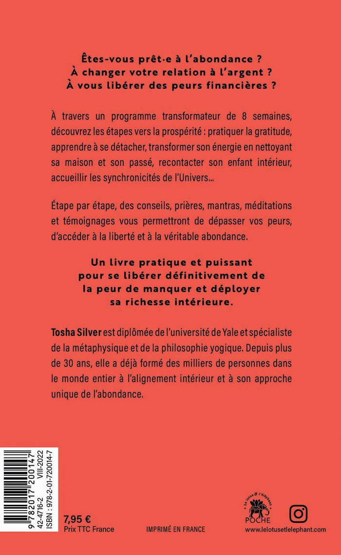 Dans "Le secret de l'abondance", Tosha Silver propose un programme de 8 semaines pour transformer sa relation à l'argent, dépasser les peurs financières et accéder à la véritable prospérité. L'auteure, diplômée de l'université de Yale et spécialiste en métaphysique, guide le lecteur à travers des étapes telles que la gratitude, le détachement, le nettoyage énergétique, la guérison du passé et la manifestation des désirs. Des conseils, prières, mantras et méditations sont inclus pour aider chacun à surmonter ses blocages et manifester l'abondance dans tous les domaines de sa vie. Afficher moinsAfficher plus