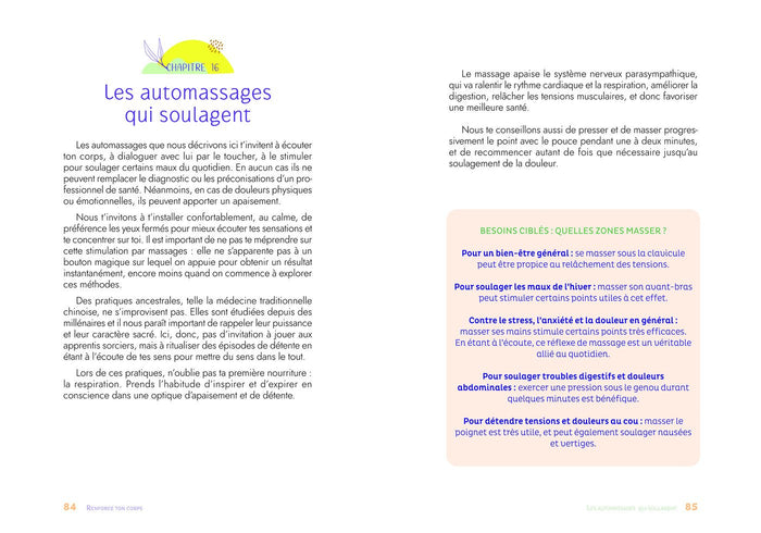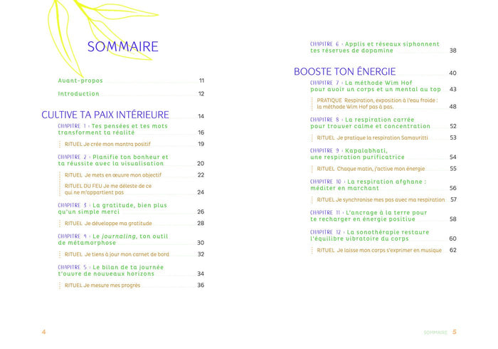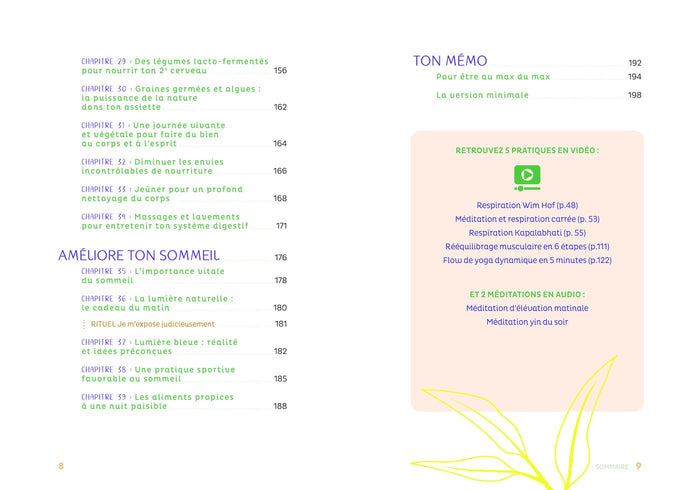 Présentation60 pratiques pour retrouver la pleine santé, un corps délié et heureux et un alignement profondà votreêtre intérieur.   1 - Cultive ta paix intérieure :visualisation, gratitude, bilan de journée, mantras et journaling comme outils de métamorphose intérieure.   2 - Booste tonénergie :méthode Wim Hof pour un corps et un mental au top, respirations pour retrouver calme et concentration, techniques d’ancrage pour te recharger…   3 - Renforce ton corps :programme hebdomadaire pour fortifier ton corps et te remettreen mouvement, automassages qui soulagent, postures de yoga pour tous les jours, brossageà sec pour amplifier ta santé…   4 - Vitalise ton alimentation :toutes les clés de l’alimentation vivante avec les bonnes associations alimentaires, les cures de jus, les légumes lacto-fermentés et le jeûne pour te recharger…   5 - Améliore ton sommeil :expositionà la lumière naturelle, pratique sportive favorable au sommeil, aliments alliés du sommeil…   + 7 vidéos et audios pour mettre en pratique ! Afficher moinsAfficher plus