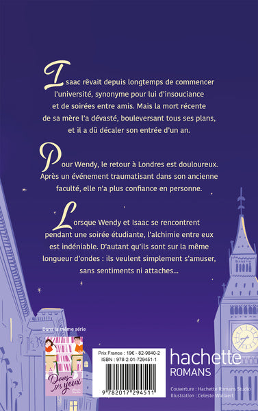 PrésentationPour Isaac, l’entréeà l’université devaitêtre un nouveau départ, fait d’insouciance et de fêtes. Au lieu de cela, il arrive un an après ses amis, dévasté par la mort récente de sa mère. Il cache du mieux qu’il peut sa douleur, en se forçantà profiter de sa nouvelle vieétudiante. Pour Wendy, le retourà Londres est difficile. Après unévénement traumatisant dans son ancienne université, trahie par les personnes en qui elle avait placé une confiance aveugle, elle se replie dans ses doutes et sa tristesse. Lorsqu’ils se rencontrent lors d’une soiréeétudiante, leur immédiate alchimie leur fait voir derrière les masques qu’ils affichent, au-delàdes barrières qu’ils imposent entre eux et le reste du monde. S’autoriseront-ilsà lâcher prise et se révéler dans les bras l’un de l’autre ? Afficher moinsAfficher plus
