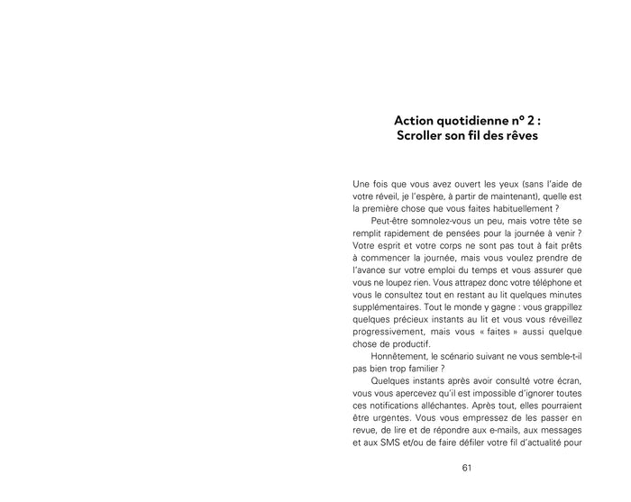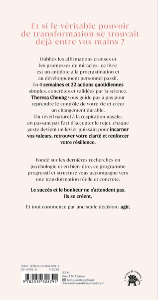 Présentation Oubliez les affirmations creuses et les promesses de miracles : ce livre est un antidoteà la procrastination et au développement personnel passif. En4 semaines et 22 actions quotidiennessimples, concrètes et validées par la science,Theresa Cheungvous guide pasà pas pour reprendre le contrôle de votre vie et créer un changement durable. Du réveil naturelà la respiration nasale, en passant par l’art d’accepter le rejet, chaque geste devient un levier puissant pourincarner vos valeurs, retrouver votre clarté et renforcer votre résilience. Fondé sur les dernières recherches en psychologie et en bien-être, ce programme progressif et structuré vous accompagne vers une transformation réelle et concrète. Le succès et le bonheur ne s’attendent pas. Ils se créent. Et tout commence par une seule décision : agir. Afficher moinsAfficher plus