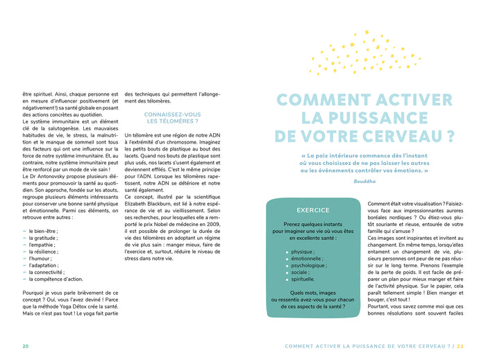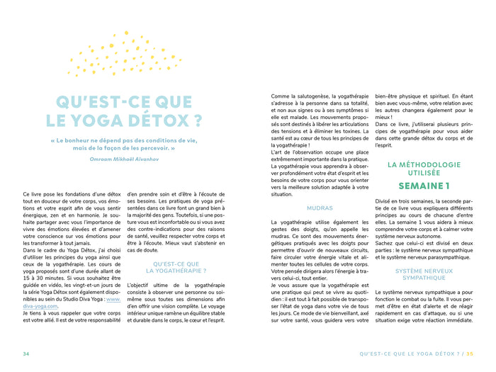 Présentation21 jours pour détoxifier le corps, lesémotions et l’esprit  !   Dans un environnement où le stress est omniprésent et où nous n'arrivons pasà répondreà tous les besoins de notre corps, il est parfois nécessaire de prendre le temps de se recentrer pour mieux comprendre les maux qui nous pénalisent. Ce guide pratique vous propose une cure de yoga complète et facileà suivre. Vous aurezà votre disposition :  •un bilan pour repérer les signaux importants (arthrose, douleurs aux articulations, anxiété, maladies du cœur, diabète, insomnie…) ;•des exercices de yoga quotidiens expliqués pasà pas ;•des témoignages dont vous pourrez tirer des enseignements et des pensées positives. Reconnue pour son authenticité et sa bienveillance, MARYSE LEHOUX est leader dans ce domaine sur Internet depuis 2007 et est l’une des top youtubeuses en yoga francophone. Elle est la fondatrice de DIVA YOGA, qui accompagne actuellement plus de 200 000 femmesà vivre  dans l’amour et la sérénité, ainsi que de l’Université Internationale de Yoga, seule université francophone au monde dédiée exclusivementà la formation  de professeurs de yoga. Afficher moinsAfficher plus
