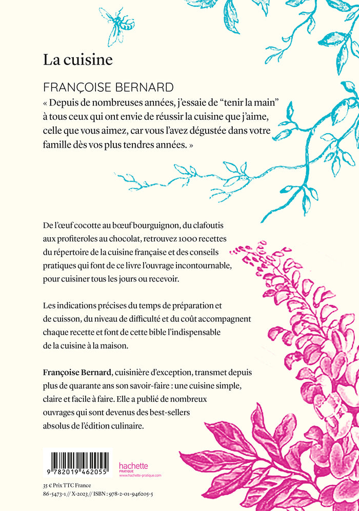 Présentation« Depuis de nombreuses années, j'essaie de“tenir la main”à tous ceux qui ont envie de réussir la cuisine que j'aime, celle que vous aimez, car vous l'avez dégustée dans votre famille dès vos plus tendres années.» De l’œuf cocotte au bœuf bourguignon, du clafoutis aux profiteroles au chocolat, retrouvez 1000 recettes du répertoire de la cuisine française et des conseils pratiques qui font de ce livre l’ouvrage incontournable, pour cuisiner tous les jours ou recevoir. Les indications précises du temps de préparation et de cuisson, du niveau de difficulté et du coût accompagnent chaque recette et font de cette bible l'indispensable de la cuisineà la maison.  Françoise Bernard, cuisinière d'exception, transmet depuis plus de quarante ans son savoir-faire : une cuisine simple, claire et facileà faire. Elle a publié de nombreux ouvrages qui sont devenus des best-sellers absolus de l'édition culinaire. Afficher moinsAfficher plus