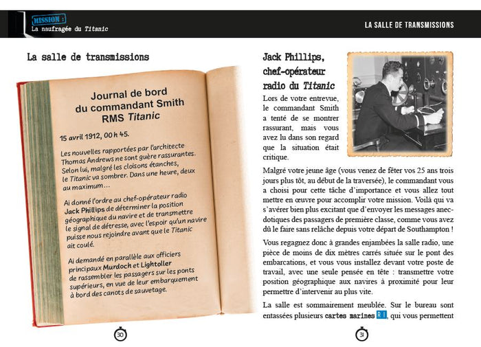 Plongez au cœur du drame du Titanic avec cet escape game de poche. Incarnez un naufragé devant tenter de survivre au naufrage du célèbre paquebot. Réussissez à vous échapper en explorant les méandres du navire, en réactivant les machines, en trouvant un navire de secours, en regagnant le pont des canots de sauvetage et en évitant un drame humain. Votre vie est en jeu, saurez-vous prendre les bonnes décisions dans ce contexte stressant et périlleux ?
