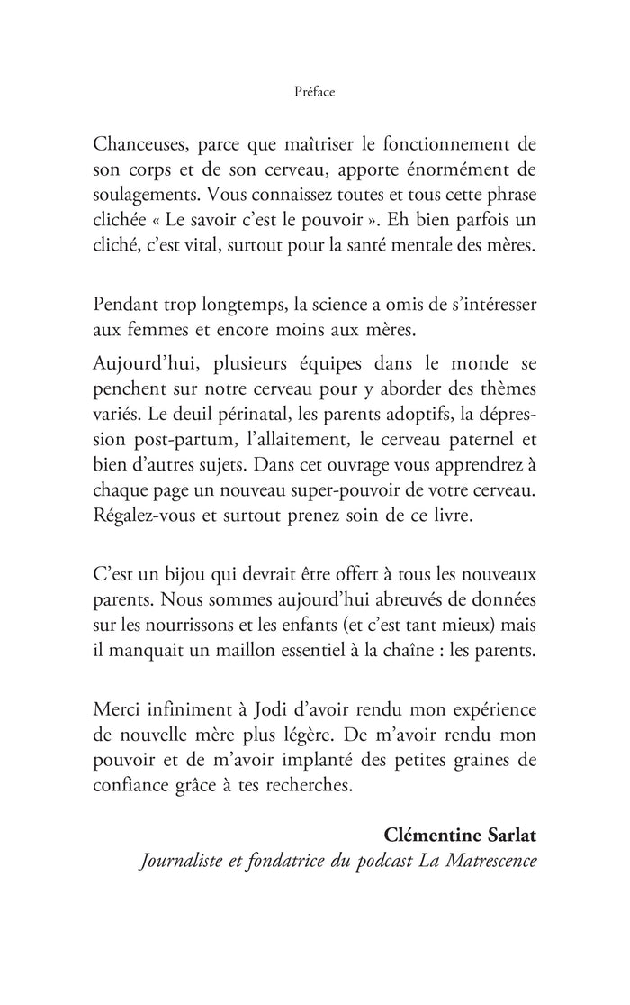Le mommy brain est le sentiment éprouvé par de nombreuses mamans (pendant la grossesse et au début de la période post-partum) que leur bébé est littéralement en train d'aspirer les cellules de leur cerveau ! C'est un peu comme si le cerveau se mettait sur pause. Oublis fréquents, confusion, manque de concentration... On lance d'ailleurs souvent à la blague que le bébé a pris une partie de la tête de la maman ! Tous ces changements sont neurologiques. Le cerveau subit une mutation et se prépare aux exigences de la maternité. Il concentre son effort sur de nouvelles zones d'apprentissage, engendrant tout à la fois une croissance émotionnelle, pratique et sensible incroyable ! Cet ouvrage propose un voyage passionnant dans l'univers chimique et fantastique du cerveau des mères et fait changer le regard souvent négatif que l'on porte sur elles. Il fournit de nombreux outils concrets pour accompagner au mieux son cerveau dans cette transformation et se préparer à accueillir la vie. Afficher moinsAfficher plus