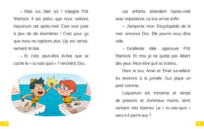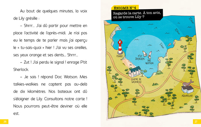 PrésentationDes histoiresfacilesà lire,adaptées aux jeunes lecteurs. Denombreuses illustrationsà observer attentivement pour résoudre lesénigmes. Lessolutionsdesénigmes au fil de l’histoire, pour ne pas bloquer la lecture. Différentes typologies d’énigmes :-  Jeux d’observation-  Jeux de lettres : rébus, mots en désordre…-  Jeux d’identification type«  Qui est-ce ? » Toute la petite bande se retrouve en classe de mer, pour apprendreà faire de la voile. Grâceà leurs talkies-walkies, P’tit Sherlock et son copain Doc Watson interceptent un message en pleine mer. Une terrible créature aété aperçue… Afficher moinsAfficher plus
