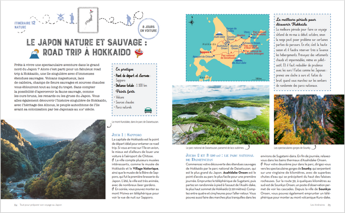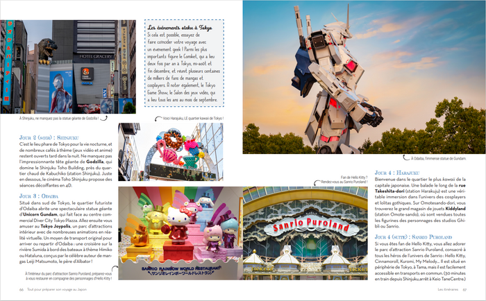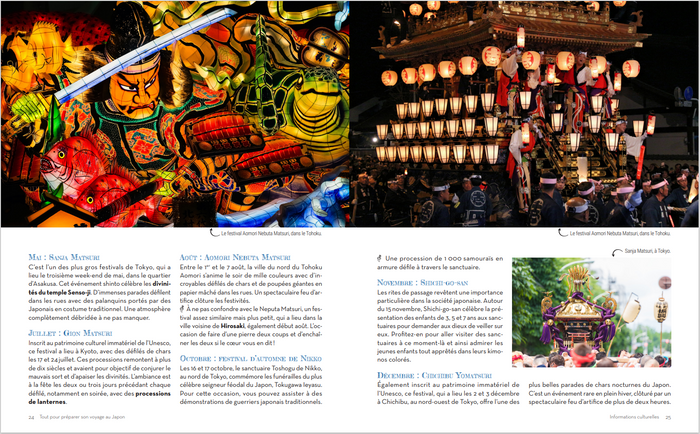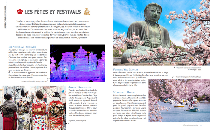 Vous rêvez de partir visiter le Japon, le pays des mangas, mais vous ne savez pas par où commencer votre périple, ni les lieux à ne pas manquer sous aucun prétexte. Ce guide, très pratique et orné de très belles photographies, vous sera indispensable pour préparer votre voyage ! Vous y trouverez les principaux sites à visiter avec un historique synthétique et des explications culturelles pour chaque site, de très belles photographies pour vous donner envie de découvrir pour de vrai ces lieux incontournables. Vous y trouverez aussi des itinéraires variés en fonction du nombre de jours que vous restez sur place, des moyens de transport que vous souhaitez privilégier sur place (voiture à louer, train ou bus) et de la teneur que vous aimeriez donner à ce séjour (culturelle, insolite, urbaine, gastronomique, etc.). Des cartes du pays, des principales villes et des grandes régions à visiter vous permettront de vous faire une idée des distances à parcourir et des zones où se trouvent les plus beaux sites. De nombreux conseils et informations pratiques vous aideront à préparer les formalités administratives, les réservations hôtelières... Enfin, des focus culturels vous éclaireront sur les traditions ancestrales du pays ainsi que les coutumes locales, et les plats les plus typiques. Afficher moinsAfficher plus
