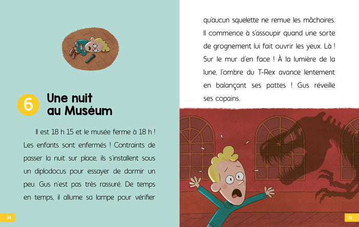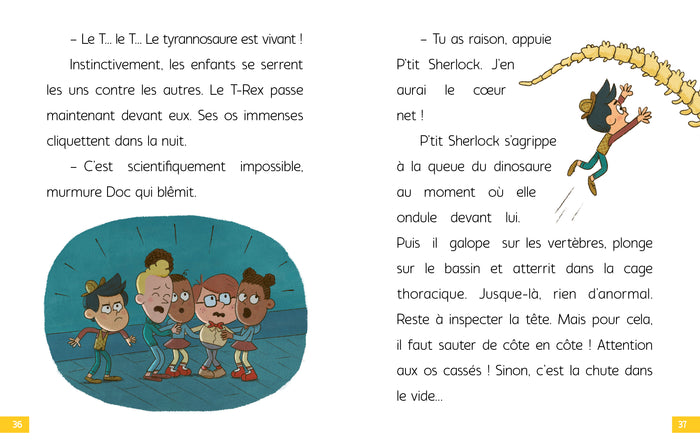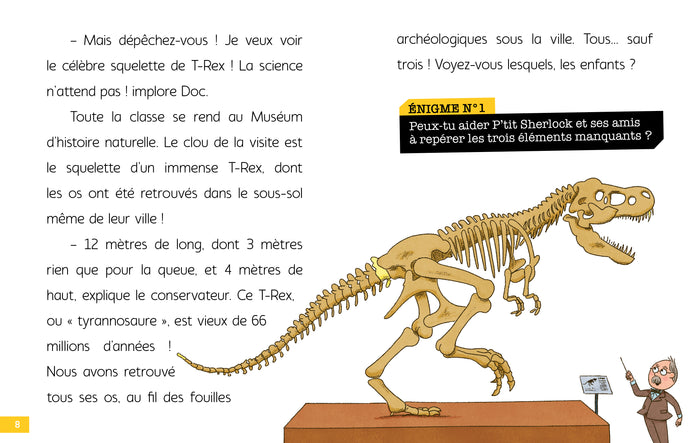 PrésentationDes histoiresfacilesà lire,adaptées aux jeunes lecteurs. Denombreuses illustrationsà observer attentivement pour résoudre lesénigmes. Lessolutionsdesénigmes au fil de l’histoire, pour ne pas bloquer la lecture. Différentes typologies d’énigmes :-  Jeux d’observation-  Jeux de lettres : rébus, mots en désordre…-  Jeux d’identification type«  Qui est-ce ? » P'tit Sherlock et ses amis vont visiter le Museum d'histoire naturelle avec comme clou de la visite : le fossile reconstitué d'un immense T-Rex ! Mais il y a un os ! Il manque 3 os pour que le squelette soit complet. P'tit Sherlock et sa bande, accompagnés de Voyou plus motivé que jamais, vont partirà la recherche des os manquants. Afficher moinsAfficher plus