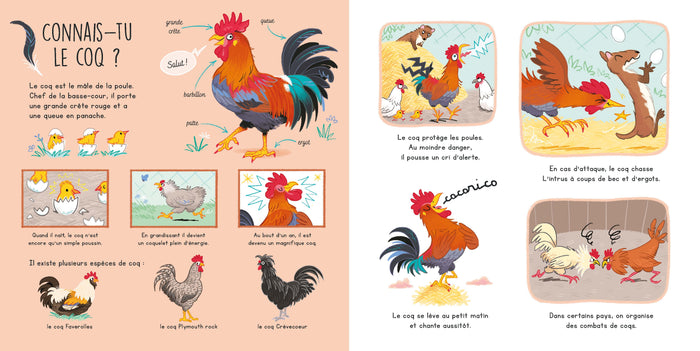 PrésentationCes petits documentaires, très simples pour les petits, présentent un focus sur 10 animaux d'un même environnement, un par double page : En page de gauche : -l'animal est présenté, en pied et légendé avec toutes ses caractéristiques. -en dessous, 3 cases systématiques présentent ses parents et le moment de sa naissance. -suivent 3 espèces différentes ou ses cousins. la page est traitée de façon documentaire. En page de droite : -4 cases d'infos supplémentaires, façon BD, toujours très simples avec des textes courts mais qui, graphiquement, peuventêtre traitées avec humour. Elles mettent en scène et en mouvement l’animal dans son environnement; - l'ouvrage se termine sur une double présentant 6 autres animaux de l'environnement puis par une belle image reprenant tous les animaux du livre dans leur décor. Afficher moinsAfficher plus