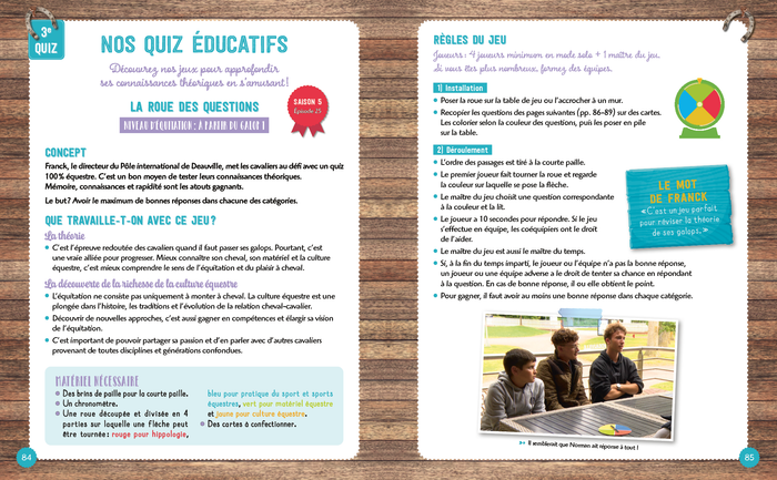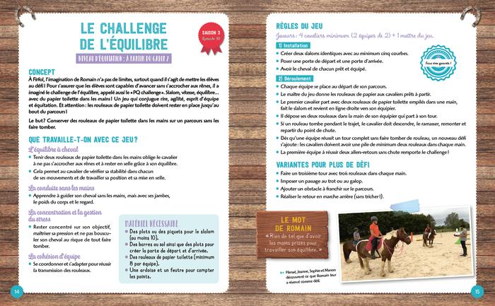 PrésentationTu adores les chevaux et l’équitation ? Tu es fan de l’émissionà succèsAu Galop ! Une saisonà cheval? Alors ce carnet de défis 100 %équitation est fait pour toi ! Découvre dans ce joli guide de nombreux conseils et des activités« testées et approuvées» par les jeunes cavaliers de Firfol, de Deauville et de Camargue ! Avec plus de40 activités insolites,jeuxetquiz, lesélèves et formateurs de l’émissionAu Galop !t’accompagnent pour progresser enéquitation, renforcer la complicité avec ton cheval et réviser tes connaissances sur les chevaux en t’amusant. Prêtà relever tous ces défis d’équitation ? Afficher moinsAfficher plus