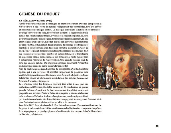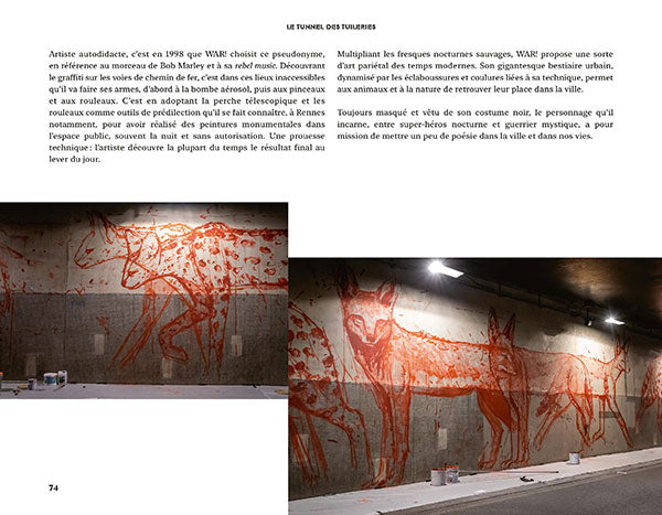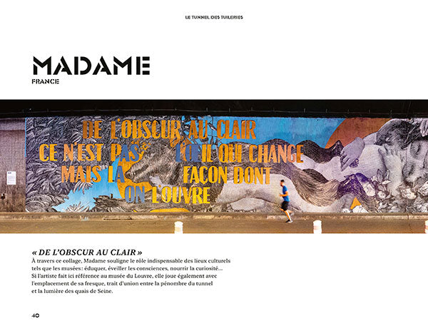 En brefPhotographies de Lionel Belluteau, Nicolas Giquel et Thomas von Wittich,PrésentationUne expérience artistique unique au coeur de la capitale !Fermé à la circulation depuis 2016, le tunnel des Tuileries (re)trouve des couleurs ! Sous la direction de Nicolas Laugero-Lasserre, une dizaine d'artistes - Madame, Romain Froquet, Jussi TwoSeven, Ërell, Lek&Sowat + Tcheko, Andrea Ravo Mattoni, WAR !, Sifat, Bault et Hydrane - ont été invité·e·s à réaliser d'immenses fresques autour de quatre grands thèmes : Paris, la Seine et ses quais, le Louvre et les Tuileries, les Jeux olympiques et paralympiques.Des oeuvres in situ révélées au public durant l'été 2022 et très vite rejointes par des centaines d'autres, réalisées spontanément par les graffeurs et street artistes du monde entier venus combler les espaces laissés libres. Véritable galerie d'art souterraine, le tunnel des Tuileries est le reflet, en constante évolution, de la création urbaine contemporaine. Afficher moinsAfficher plus