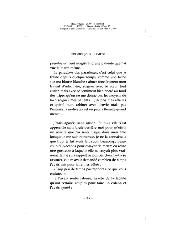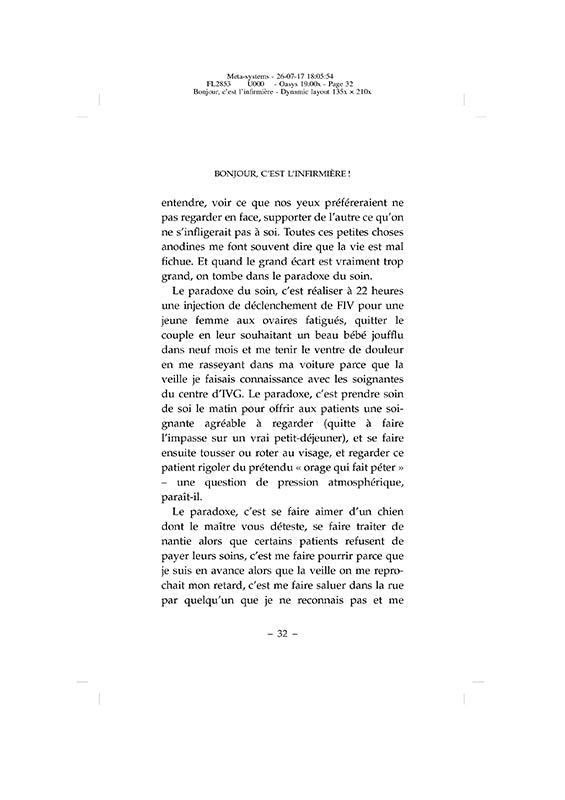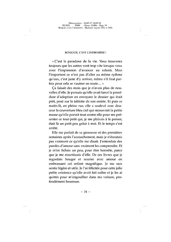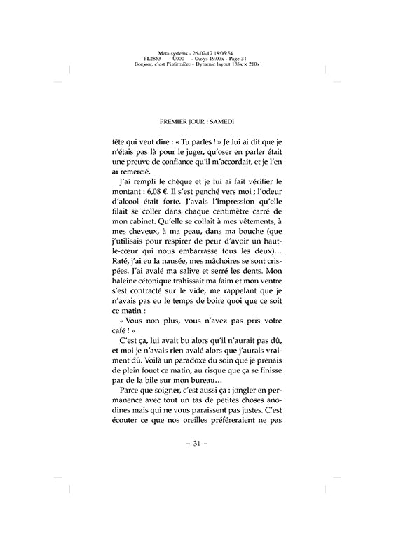 Chaque matin, Charline réveille sa voiture et sa motivation pour se rendre chez ses patients. Elle a ses chouchous, comme ce couple de vieux qui se chamaille avec la tendresse d'un vieux couple, et il y a aussi des patients difficiles, comme cet homme alcoolique et violent face à qui elle s'est sentie si vulnérable. À chacun, elle prodigue ses soins et un peu plus. Un peu plus, c'est un coeur attentif, qui écoute sans compter son temps, même si ce n'est pas remboursé par la sécurité sociale. Voilà ce qui rend ce métier si exposé, si dur parfois, et surtout si précieux. Franchissons avec elle les portes de ces maisons habitées par la maladie, la solitude, mais aussi la joie, l'espérance, l'humour (et toutes sortes d'animaux). Tendres, poignantes ou cocasses, ces histoires de patients racontent cette profession à laquelle nous confions ce que nous avons de plus intime, de plus fragile et de plus cher : nos malades.Biographie de l'auteurCharline a créé son blog « C'est l'infirmière » en 2014. Elle y partage ses joies et ses inquiétudes, et donne une voix aux soignants qui ont tant de mal à se faire entendre.