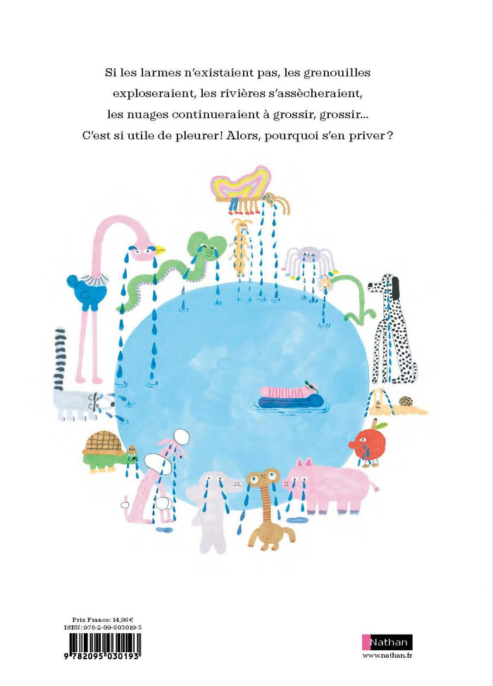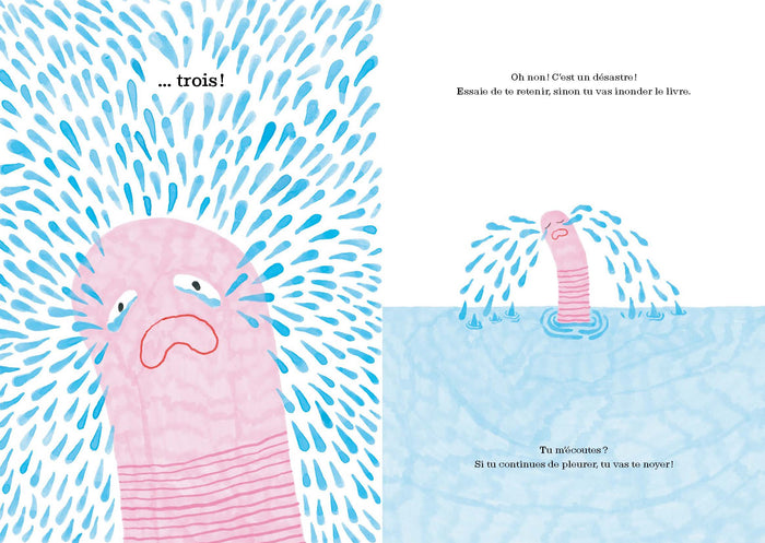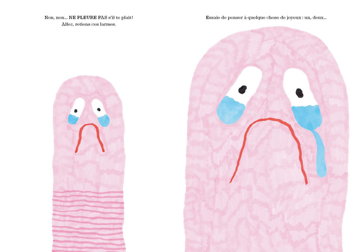 Dans cet album jeunesse, un ver de terre triste inonde les pages de ses larmes. Le narrateur tente de le réconforter en lui expliquant le rôle important des larmes, à la fois source d'émotion et de purification. Une histoire absurde, drôle et touchante, qui aborde la tristesse et le pouvoir consolateur des larmes. Afficher moinsAfficher plus