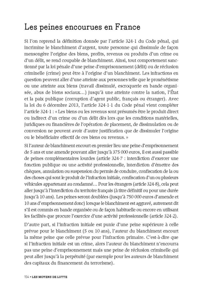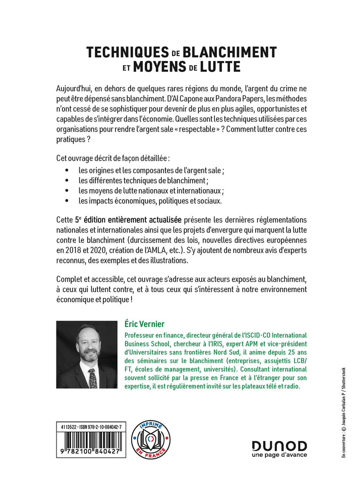 Sommaire Avant-propos Introduction Partie 1. L'argent sale Les origines de l'argent sale L'origine géographique de l'argent sale Partie  2.  Les techniques de blanchiment Les définitions et typologies du blanchiment Les techniques artisanales Les techniques financières Partie  3. Les moyens de lutte Les textes français  et européens Les organismes officiels Les  obligations des professionnels assujettis Un combat déloyal Partie 4. L'état des lieux et les enjeux internationaux. La France, un pays d'investissement et de blanchiment Les enjeux politiques,économiques et sociaux Conclusion Annexes ,Présentation Aujourd’hui, en dehors de quelques rares régions du monde, l’argent du crime ne peutêtre dépensé sans blanchiment. D’Al Capone aux Pandora Papers, les méthodes n’ont cessé de se sophistiquer pour devenir de plus en plus agiles, opportunistes et capables de s’intégrer dans l’économie. Quelles sont les techniques utilisées par ces organisations pour rendre l’argent sale« respectable» ? Comment lutter contre ces pratiques ? Cet ouvrage décrit de façon détaillée :les origines et les composantes de l’argent sale ;les différentes techniques de blanchiment ;les moyens de lutte nationaux et internationaux ;les impactséconomiques, politiques et sociaux. Cette5eédition entièrement actualiséeprésente les dernières réglementations nationales et internationales ainsi que les projets d’envergure qui marquent la lutte contre le blanchiment (durcissement des lois, nouvelles directives européennes en 2018 et 2020, création de l’AMLA, etc.). S’y ajoutent denombreux avis d’expertsreconnus, des exemples et des illustrations. Complet et accessible, cet ouvrage s’adresse aux acteurs exposés au blanchiment,à ceux qui luttent contre, età tous ceux qui s’intéressentà notre environnementéconomique et politique ! Afficher moinsAfficher plus