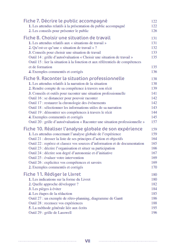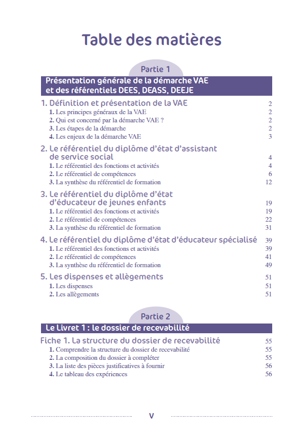 SommairePrésentation générale de la démarche VAE.Définition de la VAE. Qui est concerné par la démarche ? Conditions pour se lancer dans la démarche ; Condition personnelle et motivation ; etc. Les principes généraux et lesétapes de la démarche. Le livret 1. Le livret 2. Présentation des référentiels ASS, EJE, ES. Les dispenses. Les accompagnements et les financements possibles. Comment utiliser cet ouvrage ?Le livret 1 -“Dossier de recevabilité”.S’approprier le référentiel du diplôme visé. Faire le point sur ses expériences et les lier au référentiel.Le livret 2 : Lesétapes de la formalisation.Exposer ses motivations, ses expériences, son parcours de formation. Présenter l’environnement institutionnel de la structure. Présenter sa structure d’exercice. Se positionner dans sa structure d’exercice. Décrire le public accompagné. Choisir une situation de travail. Raconter la situation. Réaliser l’évaluation globale de son expérience.La rédaction du livret.L’entretien avec le jury.Déroulement et principes généraux de l’entretien. Préparer et formaliser sa présentation orale. Communiquer efficacementà l’oral.,PrésentationUn ouvrage complet pour préparer et réussir la VAE pour l'obtention des diplômes DEES, DEASS, DEEJE. La VAE (validation des acquis de l'expérience) est un dispositif permettantà toute personne de faire valider les acquis de son expérience professionnelle pour obtenir un diplôme, un titre ou un certificat de qualification. Cet ouvrage propose une préparation complète avec des conseils méthodologiques et des outils pour guider le candidat tout au long de sa préparation. Afficher moinsAfficher plus
