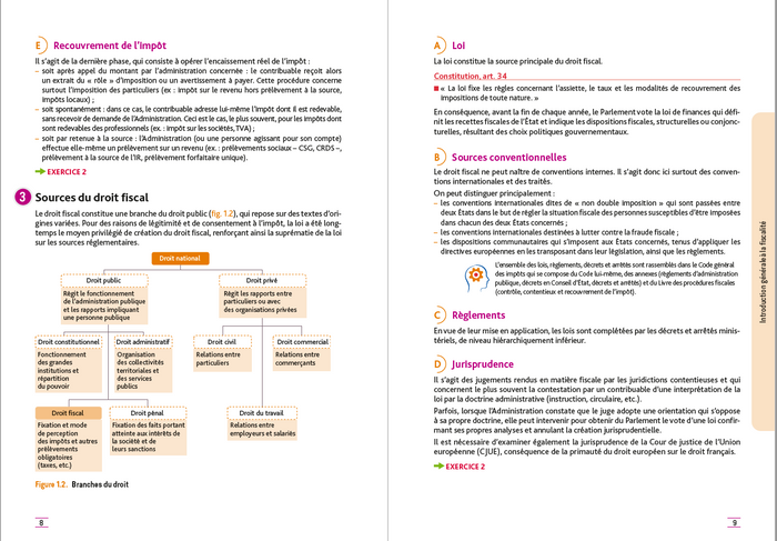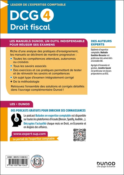 Présentation À JOUR DU PCG 2025 Tout le DCG 4, Droit fiscal, présenté conformément au programme  : Respect de la progression logique du programme et du volume horaireMise en avant des compétences et des mots-clés du programmePréparationà l'épreuve (évaluation par les compétences)Approche transversaleà travers des cas de synthèse Les + du cours  : définitions des mots-clés, exemples et focus thématiques, citations (articles phares), schémas et tableaux de synthèse, avis d'experts et ressources complémentairesLes + des applications  : des exercices variés et progressifs, uneévaluation pasà pas par les compétences, des conseils et fiches méthodologiques, un sujet type d'examen inédit intégralement corrigé, toutes les corrections des quiz et QCM ,SommaireIntroduction généraleà la fiscalitéTaxe sur la valeur ajoutée (TVA)  Principes et champ d'application  de la TVA Territorialité de la TVA  Calcul de la TVA exigible  TVA déductible  Déclaration et le paiement de la TVA - Cas de synthèse 1Imposition des résultats des entreprises et des sociétés : principes généraux Imposition du résultat des entreprises et des sociétés : principes généraux  Imposition des produits (BIC) Déductibilité des charges constatées (BIC) Amortissements, dépréciations et provisions (BIC) Régime d'imposition de splus ou moins-values et des brevetrs (BIC) Déterminaion du résultat imposable (BIC) Imposition des résultats des sociétés de personnes Champ d'appication de l'IS Assiette de l'IS Imposition des plus ou moins-values (et résultats sur brevets) (IS) Liquidation et paiement de l'IS Aides fiscales (BIC, IS) - Cas de synthèse 2Impôt sur le revenu des particuliers et des prélèvements sociaux Impôt sur le revenu et prélèvements sociaux : principes généraux  Revenus d'activité : TS, BNC et BA  Revenus du patrimoine : RF et RCM Plus-values des particuliers (PVP) Impôt sur le revenu : liquidation et paiement - Cas de synthèse 3Imposition du capital, taxes sur les salaires et contrôle fiscal Droits d'enregistrement  Impôt sur la fortune immobilière (IFI) Impôts locaux Taxes assises sur les salaires Contrôle fiscal - Cas de synthèse 4Sujet type d'examen Corrigé du sujet type d'examenQCM et quiz : corrigé Afficher moinsAfficher plus