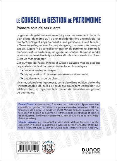 Ce livre, écrit par Pascal Pineau et Claude Lajugée, aborde la gestion de patrimoine en la comparant à la médecine. Le conseiller en gestion de patrimoine doit être un partenaire, un guide et un soutien pour ses clients. Il est présenté comme un 'docteur de l'argent'. L'ouvrage détaille en trois étapes la relation client : la découverte du prospect, la préparation des rendez-vous et la prise en charge du client. Cette deuxième édition, vivante, originale et rigoureuse, s'adresse à ceux qui veulent renforcer leur relation client et repenser leur métier de conseiller en gestion de patrimoine. Afficher moinsAfficher plus