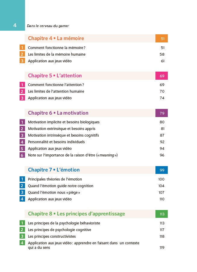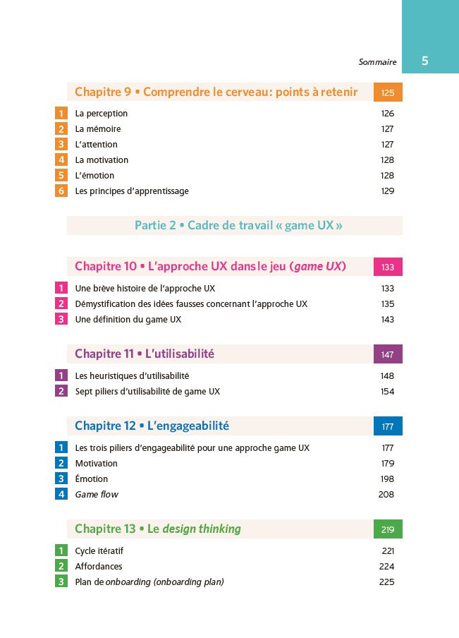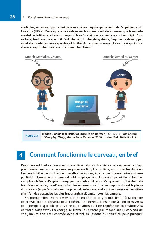 Sommaire Première partie: Comprendre le cerveau. La perception. La mémoire. L'attention. La motivation. L'émotion. Les principes de l'apprentissage. Deuxième partie: La conception UX pour les jeux vidéo. La"usability" (facilité d'usage). La"engage-ability" (l'envie d'engagement). Comprendre le joueur. Les game analytics (analyse des statistiques de jeu). La stratégie UX.   ,PrésentationQuel est le secret du succès d’un jeu vidéo ? Il n’existe ni secret ni recette miracle mais plus sûrement un certain nombre de connaissances et de méthodes qui vous guideront efficacement dans votre processus créatif. Les connaissances viennent des neurosciences et nous font comprendre comment le cerveau perçoit, traite et retient une information. Elles sont rassemblées dans la première partie de ce livre où vous découvrirez des notions comme la perception, l’attention, la mémoire, l’émotion, la motivation, les principes d’apprentissage… Les méthodes sont celles de l’approche dite expérience utilisateurs (UX) et sont rassemblées dans la seconde partie du livre. Cette approche place les joueurs au centre du processus de création et de développement. Elle vous fera réfléchir sur l’utilisabilité d’un jeu, sa capacitéà engager les joueurs, le design thinking, la stratégie UX… Cette partie se termine par une réflexion sur l’éthique dans les jeux vidéo Afficher moinsAfficher plus