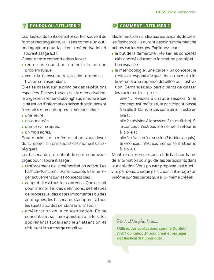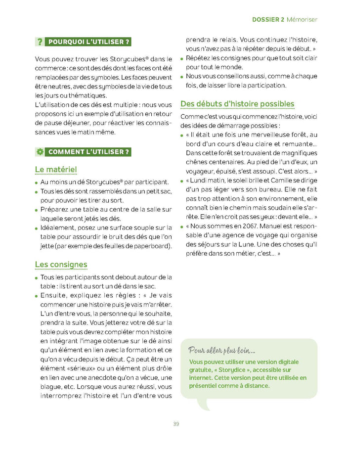 PrésentationLes participants de vos formations ont l’air de morts vivants ? Vous souhaitez des outils et méthodes pour (ré)animer vos formations ? Découvrez comment faire de la ludopédagogie votre botte secrète de la formation pour adultes ! Grâce aux 30 outils de cette petite boîteà outils, vousapprendrez comment  :utiliser le jeu quel que soit votre contexte de formation et les objectifs que vous souhaitez atteindre  ;détourner des jeux existants  ;créer votre propre jeu.Alors, prêtà jouer ensemble ?,SommaireDossier 1APPRENDREÀ SE CONNAÎTRE ET REPRENDRE DE L’ÉNERGIE  Outil 1Choisir votre icebreaker  Outil 2Relever les attentes des participants  Outil 3Utiliser le hasard  Outil 4La présentation croisée en dessins  Outil 5Trouver les points communs  Outil 6Reprendre de l’énergie avec le chef d’orchestre  Outil 7Proposer une sieste  Outil 8Mémoriser les prénoms avec le Méli-Mélo  Plan d’actionUtiliser les brise-glaces  Dossier 2MÉMORISER  Outil 9Activer les connaissances grâceà un diagramme de Venn  Outil 10Time’s Up !®  Outil 11Le Battle Quiz  Outil 12Les Storycubes®  Outil 13Réactiver les connaissances avec Jeopardy®  Outil 14Les trois questions  Outil 15Six choses que vous savez maintenant  Outil 16Money Drop®  Outil 17Créer des flashcards  EntretienUne image vaut 1 000 mots  Dossier 3FACILITER LA CRÉATIVITÉ  Outil 18Le World Café  Outil 19La méthode Lego® Serious Play®  Outil 20Faireémerger les représentations métaphoriques  Outil 21Générer un maximum d’idées grâce aux cartes mentales  Outil 22La technique de l’enveloppe  Outil 23L’analograffiti  Outil 24Créer un jeu  Outil 25 L’IA pour mener un brainstorming  Entretien  Tous les sujets se prêtent au jeu  Dossier 4  RESTER CONNECTÉ ET AMÉLIORER LA FORMATION EN CONTINU  Outil 26  La feedback door  Outil 27  La météo desémotions  Outil 28 Le retour par Post-it® de couleur  Outi6l 29ACTION !  Outil 30La pioche du feedback  EntretienQuand prendre en compte lesémotions durant une formation ?   Afficher moinsAfficher plus