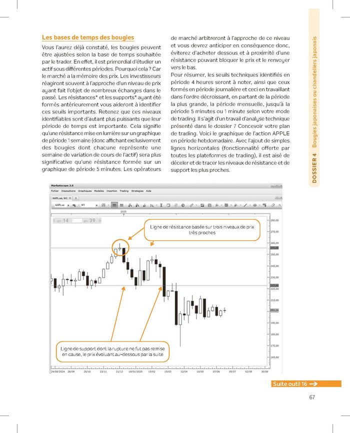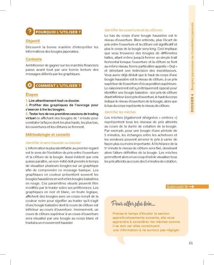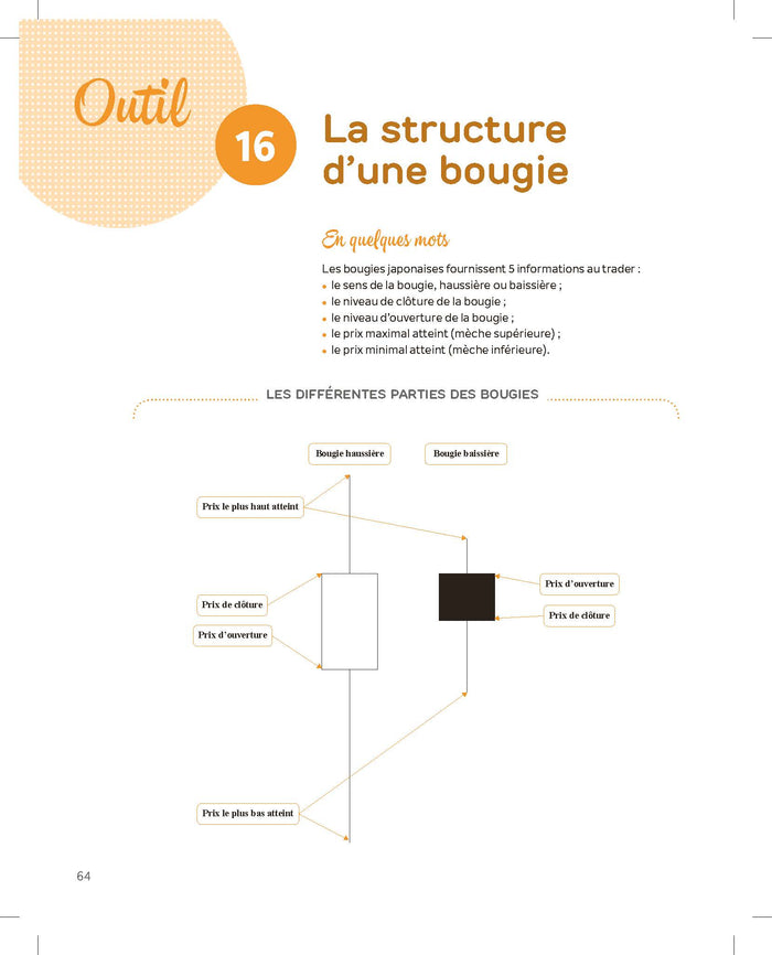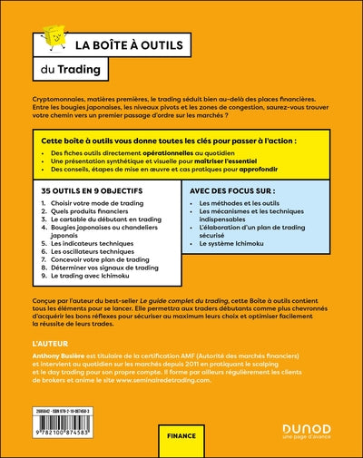 PrésentationCryptomonnaies, matières premières, le trading séduit bien au-delà des places financières.  Entre les bougies japonaises, les niveaux pivots et les zones de congestion, saurez-vous trouver votre chemin vers un premier passage d’ordre sur les marchés ? Cette boîteà outils vous donne toutes les clés pour passerà l’action : • Des fiches outils directement opérationnelles au quotidien • Une présentation synthétique et visuelle pour maîtriser l’essentiel • Des conseils,étapes de mise en oeuvre et cas pratiques pour approfondir 35 OUTILS EN 9 OBJECTIFS 1. Choisir votre mode de trading 2. Quels produits financiers 3. Le cartable du débutant en trading 4. Bougies japonaises ou chandeliers  japonais 5. Les indicateurs techniques 6. Les oscillateurs techniques 7. Concevoir votre plan de trading 8. Déterminer vos signaux de trading 9. Le trading avec Ichimoku AVEC DES FOCUS SUR : • Les méthodes et les outils • Les mécanismes et les techniques  indispensables • L’élaboration d’un plan de trading  sécurisé • Le système Ichimoku Conçue par l’auteur du best-seller Le guide complet du trading, cette Boîteà outils contient  tous leséléments pour se lancer. Elle permettra aux traders débutants comme plus chevronnés  d’acquérir les bons réflexes pour sécuriser au maximum leurs choix et optimiser facilement  la réussite de leurs trades.,SommaireDossier 1 CHOISIR VOTRE MODE DE TRADING • Outil 1 Appréhender le swing trading • Outil 2 Appréhender le day trading . • Outil 3 Appréhender le scalping Dossier 2 QUELS PRODUITS FINANCIERS ? • Outil 4 Comprendre la mosaïque des instruments financiers  • Outil 5 Comprendre les actions  • Outil 6 Comprendre les CFD (Contracts for Difference) • Outil 7 Comprendre les contrats futures • Outil 8 Comprendre les paires de devises (FOREX– Foreign Exchange)  • Outil 9 Comprendre les cryptomonnaies  • Outil 10 S’approprier les instruments financiers du swing trading • Outil 11 S’approprier les instruments financiers  du day trading et du scalping Dossier 3 LE CARTABLE DU DÉBUTANT EN TRADING • Outil 12 Choisir ordinateurs, smartphones,écrans et débit web  • Outil 13 Le capital de départ • Outil 14 Le choix du courtier ou du broker  • Outil 15 Le choix d’une plateforme de trading Dossier 4 BOUGIES JAPONAISES OU CHANDELIERS JAPONAIS • Outil 16 La structure d’une bougie  • Outil 17 Les mèches  • Outil 18 La volatilité Dossier 5 LES INDICATEURS TECHNIQUES  • Outil 19 Les bandes de Bollinger • Outil 20 Les moyennes mobiles exponentielles • Outil 21 Le SAR Dossier 6 LES OSCILLATEURS TECHNIQUES • Outil 22 LE MACD  • Outil 23 LE CCI  • Outil 24 LE RSI Dossier 7 CONCEVOIR VOTRE PLAN DE TRADING • Outil 25 Architecture générale d’un plan de trading  • Outil 26 Plan de trading sur signal unique  • Outil 27 Plan de trading multisignaux • Outil 28 L’analyse technique  • Outil 29 Les dangers de l’effet de levier Dossier 8 DÉTERMINER VOS SIGNAUX DE TRADING • Outil 30 Les signaux des MME  • Outil 31 Les signaux des bandes de Bollinger Dossier 9 LE TRADING AVEC ICHIMOKU  • Outil 32 Comprendre le concept de base • Outil 33 La Kijun et la Tenkan  • Outil 34 La Chicou  • Outil 35 La Span A, la Span B, le nuage et les Twists  Glossaire Afficher moinsAfficher plus
