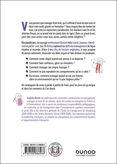 SommaireIntroduction Défi n°1Gérer les tensions de rôles Défi n°2Créer de l’intelligence collective Défi n°3Le nécessaire alignement Défi n°4Donner du sens ou révéler le sens Défi n°5Permettre le droità l’erreur Défi n°6Savoir gérer son temps Défi n°7Conduire le changement Défi n°8Être assertif Défi n°9Oser la confiance Défi n°10Lutter contre les préjugés Défi n°11Manager dans l’intergénérationnel Défi n°12Aller au-delà des apparences Défi n°13Faire un beau discours enthousiasmant Défi n°14Se faire plaisir au travail Défi n°15Être courageux Défi n°16Gérer sesémotions Défi n°17Manager son manager Défi n°18Manager dans la diversité Défi n°19 Être un manager agile Défi n°20  Développer ses soft skills Défi n°21  Manager quand on est une femme Défi n°22Manager le changement Défi n°23Conduire une réunion efficace et sereine Défi n°24Penser au contrat psychologique Défi n°25Activer son pouvoir d’agir Défi n°26Piloter la symétrie des attentions Défi n°27Oublier les comportements irresponsables Défi n°28Savoir prendre des décisions Défi n°29Travailler avec un manager incompétent Défi n°30Manager dans un environnement hybride Conclusion,PrésentationVous pensiez que managerétait inné, qu’il suffisait d’avoir du bon sens et  deux-trois outils glanés en formation ? Vous risquez bien de tomber de  haut, car entre les injonctions paradoxales, les réunions sans fin et les  attentes floues, on se prend vite les pieds dans le tapis ! Dans ce grandécart,  peut-être vous sentez-vous seul, perdu, parfois même illégitime ? Déculpabilisant, cet ouvrageentièrement illustrémêleclarté,humour,honnêteté etparler-vrai. Ses 30 fiches explorent les défis du management de façon  intuitive et incarnée. Grâceà ses clés de lecture originales, il vous propose  de penser autrement, bousculer vos idées reçues et faireévoluer vos pratiques.Comment rester aligné quand tout pousseà se disperser ?Comment faire confiance, gérer sesémotions ?Comment manager son propre manager ?Comment ne pas reproduire les comportements qu’on a subis ?Ou encore, comment manager quand on est une femme,dans un environnement qui ne l’a pas toujours prévu ? Un compagnon de routeà garderà portée de main, pour les jours oùça tangue  et dans les moments où l’on doute. Afficher moinsAfficher plus