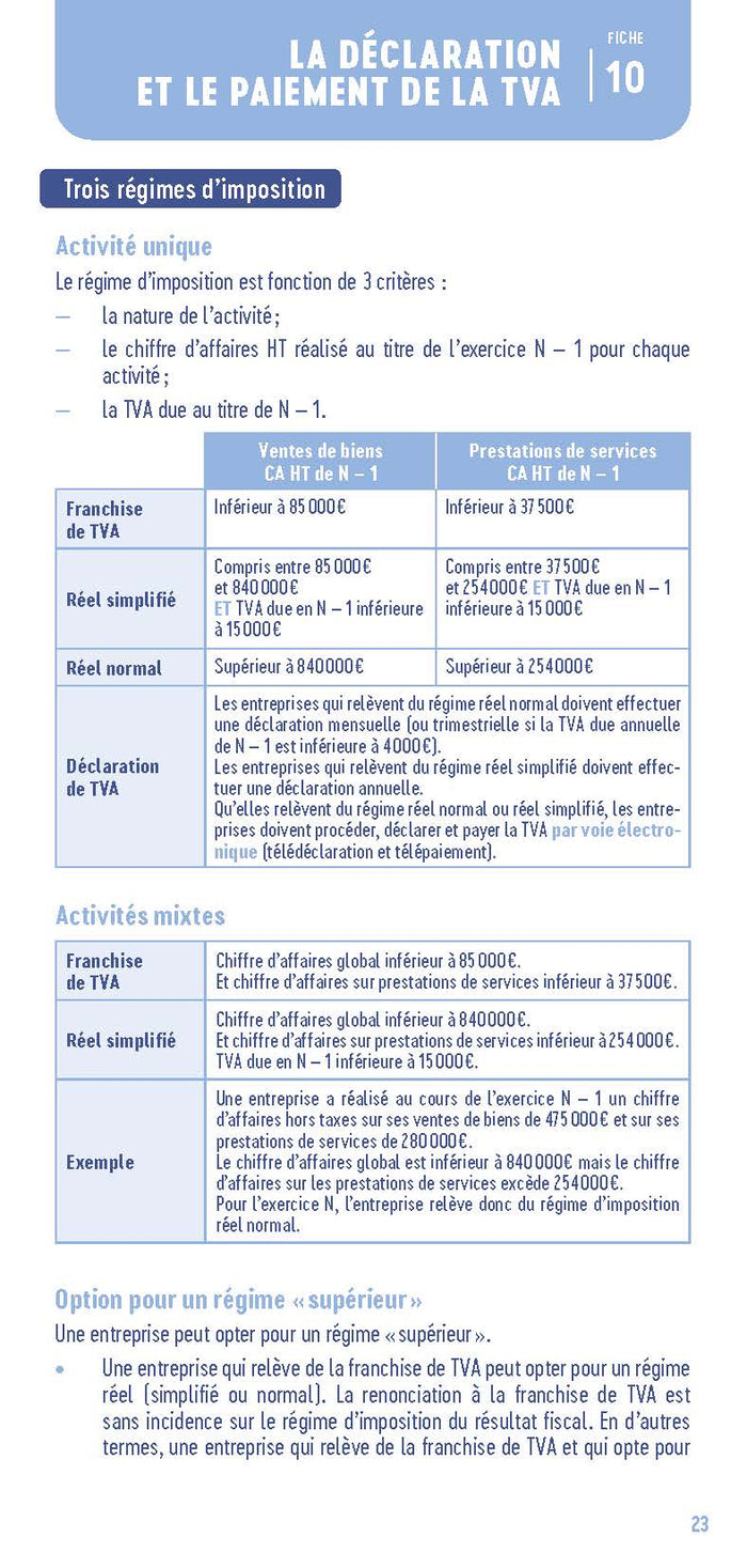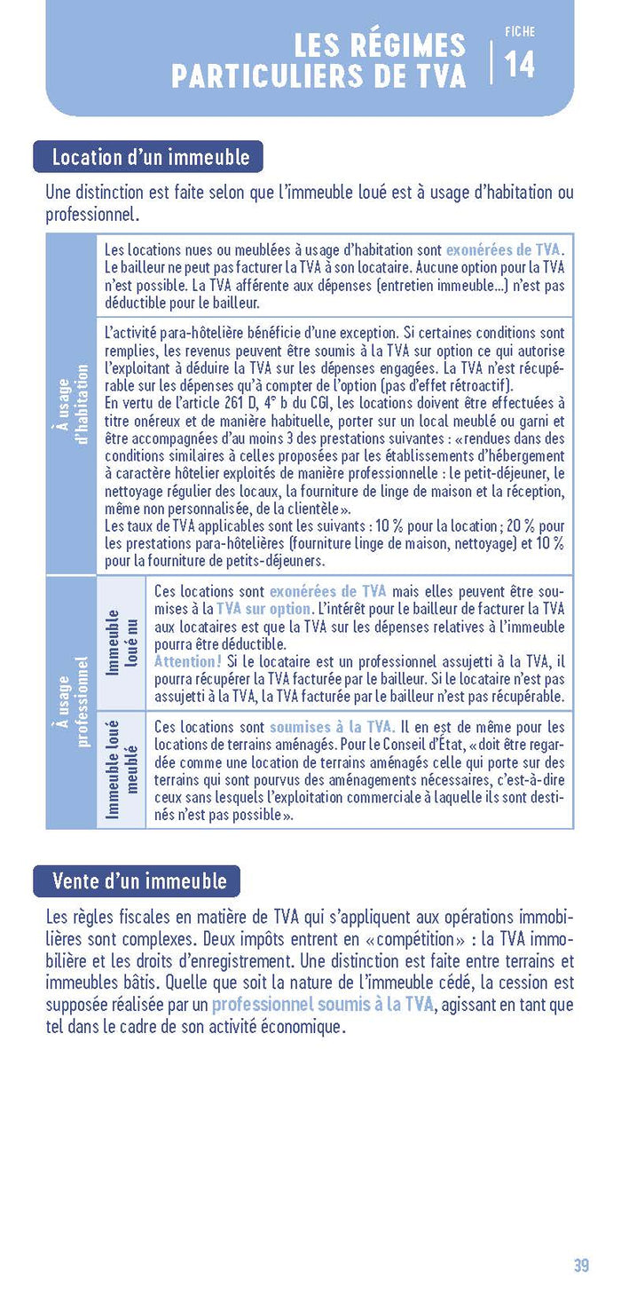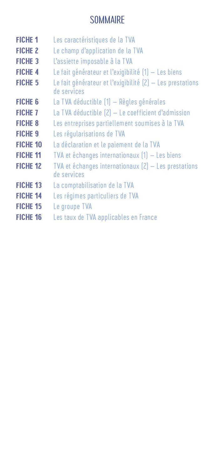 Sommaire1. Les caractéristiques de la TVA 2. Le champ d'application de la TVA 3. L'assiette imposableà la TVA 4. Le fait générateur et l'exigibilité - les biens 5. Le fait générateur et l'exigibilité - les prestations de services 6. La TVA déductible - règles générales 7. La TVA déductible - le coefficient d'admission 8. Les entreprises partiellement soumisesà la TVA 9. Les régularisations de TVA 10. La déclaration et le paiement de la TVA 11. TVA etéchanges internationaux - les biens 12. TVA etéchanges internationaux - les prestations de services 13. La comptabilisation de la TVA 14. Les régimes particuliers de la TVA 15. Le groupe TVA 16. Les taux de TVA applicables en France,PrésentationEn 48 pages et 16 fiches pratiques, le  Petit TVAfournit toutes les notions indispensables pourcalculer, déclarer et comptabiliser la TVA, avec de nombreux exemples chiffrés, en présentant notamment :les règles de baseles assujettis et les redevables partielsles activités partiellement soumisesà la TVAles obligations déclaratives et comptablesleséchanges internationaux et l'e-commerceles régimes spéciaux et particuliersLe Petit TVA està jour de laloi de finances 2024. ++ Inclus : un test interactif pour tester ses connaissances ++ ------------------------------------→ Depuis 20 ans, Les Petits Experts  récapitulent les chiffres, données et savoir-faire clés en gestion d'entreprise. Indispensables, précis et pratiques, ils sont  structurés en fiches synthétiques, dans un format très accessible de 48 pages.→  Avec une vingtaine de titres misà jour chaque année, ils sont un repère  incontournable pour tout étudiant ou professionnel.------------------------------------ Afficher moinsAfficher plus