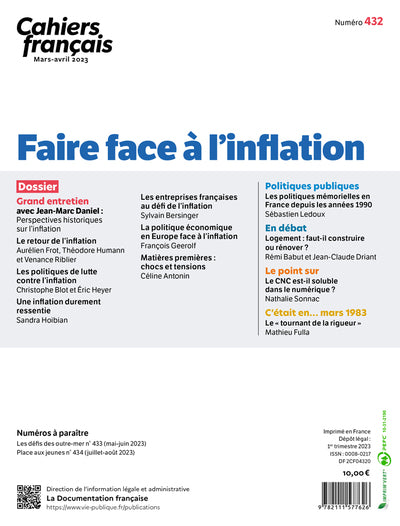 Ce numéro des Cahiers français, édité par La Documentation Française, se penche sur le phénomène de l'inflation. Il explique en quoi consiste l'inflation, ses causes, ses effets sur les ménages, les entreprises et l'économie en général. Il propose également des pistes de réflexion sur les politiques à mettre en place pour lutter contre l'inflation. Afficher moinsAfficher plus