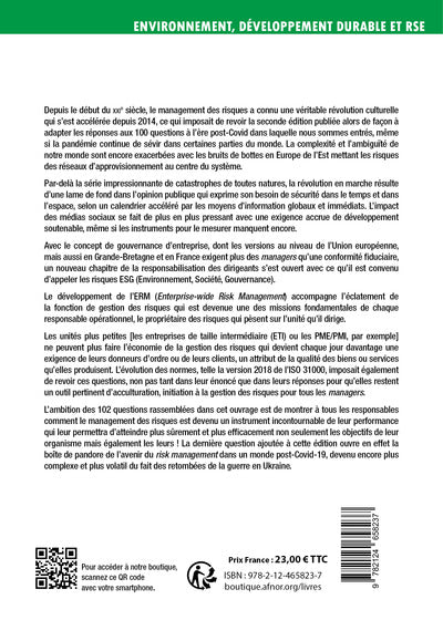 Ce livre de Jean-Paul Louisot, expert en management des risques, propose une approche actualisée et complète de la gestion des risques dans un monde en perpétuelle évolution. L'auteur aborde les nouvelles problématiques liées aux risques post-Covid, à la gouvernance d'entreprise et aux enjeux environnementaux, sociaux et de gouvernance. L'ouvrage comprend 102 questions pratiques pour aider les responsables à intégrer le management des risques dans leur stratégie et à garantir la pérennité de leur organisation. Afficher moinsAfficher plus