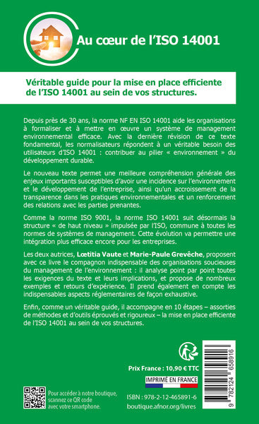 4e de couverture Depuis près de 30 ans, la norme NF EN ISO 14001 aide les organisations à formaliser et à mettre en oeuvre un système de management environnemental efficace. Avec la dernière révision de ce texte fondamental, les normalisateurs répondent à un véritable besoin des utilisateurs d'ISO 14001 : contribuer au pilier « environnement » du développement durable. Le nouveau texte permet une meilleure compréhension générale des enjeux importants susceptibles d'avoir une incidence sur l'environnement et le développement de l'entreprise, ainsi qu'un accroissement de la transparence dans les pratiques environnementales et un renforcement des relations avec les parties prenantes. Comme la norme ISO 9001, la norme ISO 14001 suit désormais la structure « de haut niveau » impulsée par l'ISO, commune à toutes les normes de systèmes de management. Cette évolution va permettre une intégration plus efficace encore pour les entreprises. Les deux autrices, Loetitia Vaute et Marie-Paule Grevêche, proposent avec ce livre le compagnon indispensable des organisations soucieuses du management de l'environnement : il analyse point par point toutes les exigences du texte et leurs implications, et propose de nombreux exemples et retours d'expérience. Il prend également en compte les indispensables aspects réglementaires de façon exhaustive. Enfin, comme un véritable guide, il accompagne en 10 étapes - assorties de méthodes et d'outils éprouvés et rigoureux - la mise en place efficiente de l'ISO 14001 au sein de vos structures. ,Présentation Depuis près de 30 ans, la norme NF EN ISO 14001 aide les organisations à formaliser età mettre en oeuvre un système de management environnemental efficace. Avec la dernière révision de ce texte fondamental, les normalisateurs répondent à un véritable besoin des utilisateurs d'ISO 14001 : contribuer au pilier « environnement » du développement durable. Le nouveau texte permet une meilleure compréhension générale des enjeux importants susceptibles d'avoir une incidence sur l'environnement et le développement de l'entreprise, ainsi qu'un accroissement de la transparence dans les pratiques environnementales et un renforcement des relations avec les parties prenantes. Comme la norme ISO 9001, la norme ISO 14001 suit désormais la structure « de haut niveau » impulsée par l'ISO, commune à toutes les normes de systèmes de management. Cette évolution va permettre une intégration plus efficace encore pour les entreprises. Les deux autrices, Loetitia Vaute et Marie-Paule Grevêche, proposent avec ce livre le compagnon indispensable des organisations soucieuses du management de l'environnement : il analyse point par pointtoutes les exigences du texte et leurs implications, et propose de nombreux exemples et retours d'expérience. Il prend également en compte les indispensables aspects réglementaires de façon exhaustive. Enfin, comme un véritable guide, il accompagne en 10 étapes - assorties de méthodes et d'outils éprouvés et rigoureux - la mise en place efficiente de l'ISO 14001 au sein de vos structures. Afficher moinsAfficher plus