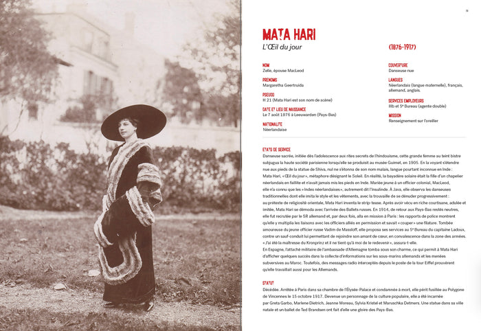 Présentation On les appelait la Porte de la nuit, la Cléopâtre de la Sécession, le Bijou de l'Orient, le Sphinx aux yeux d'émeraude...Dans le monde obscur du renseignement, il y eut la Jeanne d'Arc du Nord et celle du Mandchoukouo, la Mata Hari de l'Orient et celle des Caraïbes, deux Mata Hari russes, la folâtre Mademoiselle Fox-trot et la diabolique Fräulein Doktor... Autant de grandes espionnes qui, des temps bibliques à nos jours, s'ingénièrent à changer le cours de l'histoire, avec les moyens à leur disposition. Des cocottes à aigrette aux premières parachutistes, Bruno Fuligni nous livre le fichier illustré de ces femmes d'exception qui marquèrent pour toujours l'histoire des services secrets.   Bruno Fuligni, haut fonctionnaire, écrivain, historien, maître de conférences à Sciences Po, est l'auteur de trente livres sur l'histoire politique et le renseignement. Il est lieutenant-colonel dans la réserve citoyenne (2e RPIMa). Afficher moinsAfficher plus