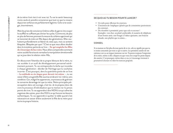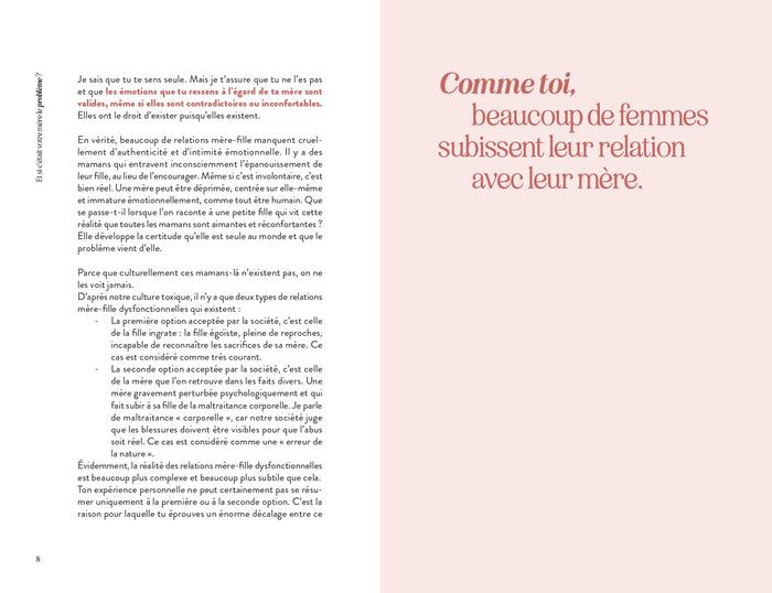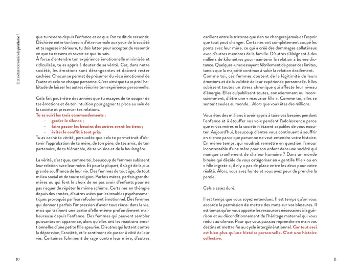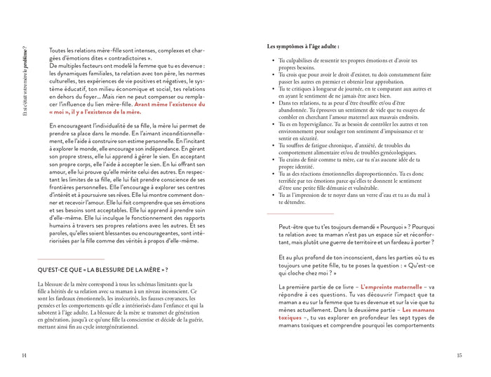 Dans son ouvrage, Clémence Biel s'adresse aux femmes qui entretiennent des relations complexes avec leur mère. Elle aborde la question des mères toxiques, du poids de l'influence maternelle et des schémas hérités qui peuvent entraver l'épanouissement. À travers des témoignages, des outils issus des neurosciences et de la thérapie cognitive, l'auteure guide les lectrices sur le chemin de la libération et de la construction d'elles-mêmes. Un ouvrage qui invite à la réflexion et à la transformation, en brisant les tabous et en offrant un soutien précieux aux femmes en quête d'émancipation.