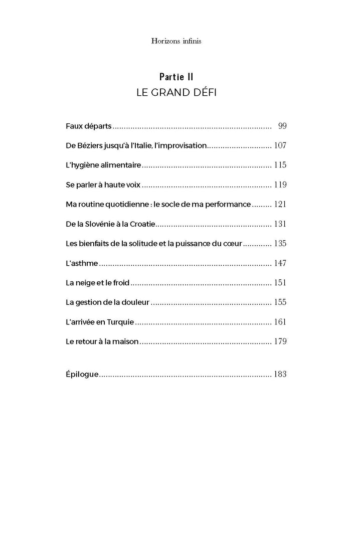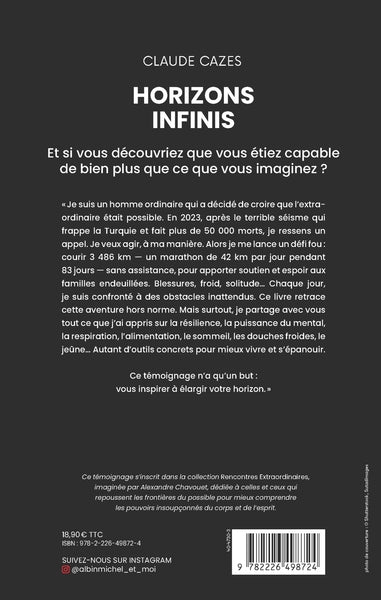 Dans « Horizons infinis », Claude Cazes relate son défi hors du commun : parcourir 3486 km en courant, soit un marathon par jour pendant 83 jours, sans assistance. Cette aventure fait suite à un appel ressenti après le séisme de 2023 en Turquie. L'auteur partage les leçons de résilience, de dépassement de soi et de bien-être qu'il a tirées de cette expérience, incluant des aspects tels que la puissance du mental, la gestion du stress, ou encore les bienfaits de la respiration et de l'alimentation. Un récit inspirant faisant partie de la collection 'Rencontres Extraordinaires'. Afficher moinsAfficher plus
