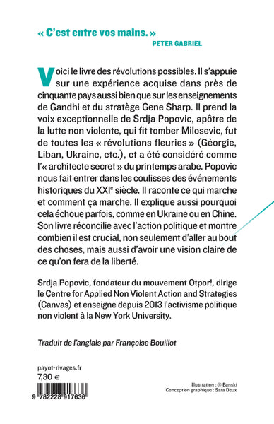 Voici le livre des révolutions possibles. Il s'appuie sur une expérience acquise dans près de cinquante pays aussi bien que sur les enseignements de Gandhi et du stratège Gene Sharp. Il prend la voix exceptionnelle de Srdja Popovic, apôtre de la lutte non violente, qui fit tomber Milosevic, fut de toutes les « révolutions fleuries » (Géorgie, Liban, Ukraine, etc.), et a été considéré comme « l'architecte secret » du printemps arabe. Popovic nous fait entrer dans les coulisses des événements historiques du xxie siècle. Il raconte ce qui marche et comment ça marche. Il explique aussi pourquoi cela échoue parfois, comme en Ukraine ou en Chine. Son livre réconcilie avec l'action politique et montre combien il est crucial, non seulement d'aller au bout des choses, mais aussi d'avoir une vision claire de ce qu'on fera de la liberté.