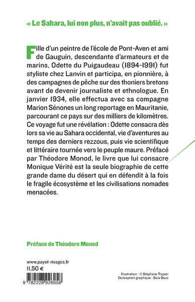 Fille d'un peintre de l'école de Pont-Aven et ami de Gauguin, descendante d'armateurs et de marins, Odette du Puigaudeau (1894-1991) fut styliste chez Lanvin et participa, en pionnière, à des campagnes de pêche sur des thoniers bretons avant de devenir journaliste et ethnologue. En janvier 1934, elle effectua avec sa compagne Marion Sénones un long reportage en Mauritanie, parcourant ce pays sur des milliers de kilomètres. Ce voyage fut une révélation : Odette consacra dès lors sa vie au Sahara occidental, vie d'aventures au temps des derniers rezzous, puis vie scientifique et littéraire tournée vers le peuple maure. Préfacé par Théodore Monod, le livre que lui consacre Monique Vérité est la seule biographie de cette grande dame du désert qui en défendit à la fois le fragile écosystème et les civilisations nomades menacées.