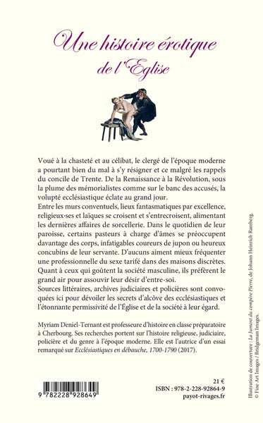 PrésentationVoué à la chasteté et au célibat, le clergé de l'époque moderne a pourtant bien du mal à s'y résigner et ce malgré les rappels du concile de Trente. De la Renaissance à la Révolution, sous la plume des mémorialistes comme sur le banc des accusés, la volupté ecclésiastique éclate au grand jour. Entre les murs conventuels, lieux fantasmatiques par excellence, religieux.ses et laïques se croisent et s'entrecroisent, alimentant les dernières affaires de sorcellerie. Dans le quotidien de leur paroisse, certains pasteurs à charge d'âmes se préoccupent davantage des corps, infatigables coureurs de jupon ou heureux concubins de leur servante. D'aucuns aiment mieux fréquenter une professionnelle du sexe tarifé dans des maisons discrètes. Quant à ceux qui goûtent la société masculine, ils préfèrent le grand air pour assouvir leur désir d'entre-soi. Sources littéraires, archives judiciaires et policières sont convoquées ici pour dévoiler les secrets d'alcôve des ecclésiastiques et l'étonnante permissivité de l'Église et de la société à leur égard. Myriam Deniel-Ternant est professeure d'histoire en classe préparatoire à Cherbourg. Ses recherches portent sur l'histoire religieuse, judiciaire, policière et du genre à l'époque moderne. Elle est l'autrice d'un essai remarqué sur Ecclésiastiques en débauche, 1700-1790 (2017). Afficher moinsAfficher plus