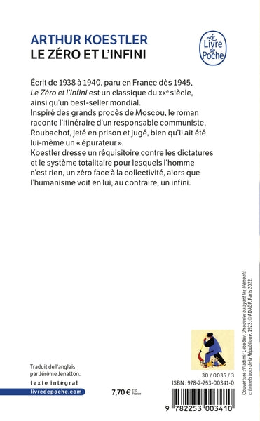 Écrit de 1938 à 1940, paru en France dès 1945, Le Zéro et l'Infini est un des grands « classiques » du XXè siècle, ainsi qu'un best-seller mondial. Inspiré des grands procès de Moscou, le roman imagine l'itinéraire d'un responsable communiste, Roubachof, jeté en prison et jugé après avoir été lui-même un « épurateur ». A travers ce thème, l'écrivain nous convie à un véritable procès des dictatures et du système totalitaire pour lesquels l'homme n'est rien, un zéro en regard de la collectivité, alors que l'humanisme voit en lui, au contraire, un infini. Le Zéro et l'Infini est de ces oeuvres dont le temps n'abolit pas la portée.Biographie de l'auteurJuif hongrois né à Budapest en 1905, Arthur Koestler fait ses études à Vienne, puis devient journaliste en Palestine. Revenu en Europe, il adhère au Parti communiste allemand, trouvant là une réponse à la menace nazie, mais également séduit par l'utopie soviétique. Il part un an en URSS, puis participe à la guerre civile espagnole. À partir de 1938, ayant rompu avec le Parti communiste, il combattra sans relâche le régime stalinien, notamment à travers son roman majeur, Le Zéro et l'Infini. À partir de 1940, il vit en Angleterre, où il se suicidera avec sa femme en mars 1983. Son oeuvre de romancier, philosophe, historien et essayiste lui vaut une renommée mondiale.