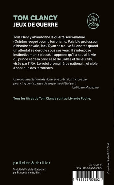 Tom Clancy abandonne la guerre sous-marine (Octobre rouge) pour le terrorisme. Paisible professeur d'histoire navale, le héros de ce livre se trouve à Londres quand un attentat se déroule sous ses yeux. Il s'interpose instinctivement ; blessé, il apprend qu'il a sauvé la vie du prince et de la princesse de Galles et de leur fils, visés par l'I.R.A. Le voici promu héros national... et cible, à son tour, des terroristes.Biographie de l'auteurTom Clancy est né en 1947 à Baltimore. Il poursuit des études d’anglais puis tente d’intégrer l’US Army. Mais sa mauvaise vue l’empêche de participer à la guerre du Vietnam. Il écrit alors un roman inspiré de l’histoire vraie de sous-mariniers russes désireux de passer à l’Ouest : Octobre rouge... C’est ainsi que débute la carrière de Tom Clancy, dont les thrillers, ultradocumentés et souvent prémonitoires, sont tous des best-sellers. Tom Clancy est décédé en 2013.