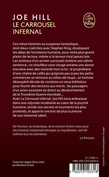 Recueil de treize nouvelles au suspense fantastique, où Joe Hill explore les méandres de l'âme humaine. Entre horreur, science-fiction et étrangeté, les lecteurs sont plongés dans des récits troublants et captivants. Des animaux d'un carrousel vengeur aux conséquences d'une lecture aux morts, en passant par une danse macabre avec un chauffeur sans visage, l'auteur démontre son talent dans la diversité des genres abordés. Ces histoires, parfois co-écrites avec Stephen King, laissent une empreinte durable dans l'esprit de ceux qui osent s'y aventurer. Afficher moinsAfficher plus