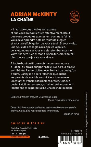 Rachel, une mère, reçoit un appel lui annonçant que sa fille a été kidnappée. Pour la sauver, elle doit à son tour enlever un enfant. Ainsi débute un terrible engrenage où chaque parent devient à la fois victime et criminel, piégé par la mystérieuse organisation appelée la Chaîne. Un thriller psychologique haletant où les enjeux sont plus grands que tout. Afficher moinsAfficher plus
