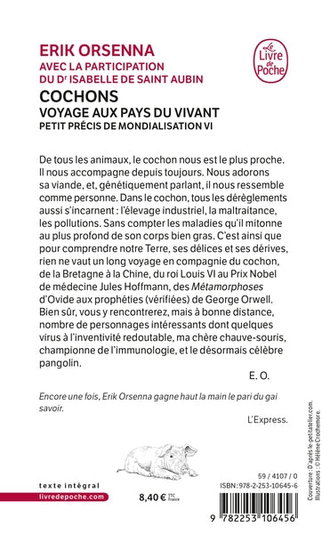 Présentation De tous les animaux, le cochon nous est le plus proche. Il nous accompagne depuis toujours. Nous adorons sa viande, et, génétiquement parlant, il nous ressemble comme personne. Dans le cochon, tous les dérèglements aussi s’incarnent : l’élevage industriel, la maltraitance, les pollutions. Sans compter les maladies qu’il mitonne au plus profond de son corps bien gras. C’est ainsi que pour comprendre notre Terre, ses délices et ses dérives, rien ne vaut un long voyage en compagnie du cochon, de la Bretagneà la Chine, du roi Louis VI au Prix Nobel de médecine Jules Hoffmann, des Métamorphoses d’Ovide aux prophéties (vérifiées) de George Orwell. Bien sûr, vous y rencontrerez, maisà bonne distance, nombre de personnages intéressants dont quelques virusà l’inventivité redoutable, ma chère chauve-souris, championne de l’immunologie, et le désormais célèbre pangolin. E. O. Encore une fois, Erik Orsenna gagne haut la main le pari du gai savoir. L’Express. Afficher moinsAfficher plus