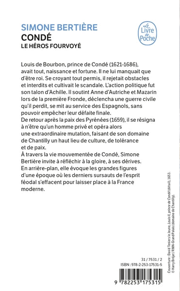 Présentation Louis de Bourbon, prince de Condé (1621-1686), avait tout, naissance et fortune. Il ne lui manquait que d’être roi. Se croyant tout permis, il rejetait obstacles et interdits et cultivait le scandale. L’action politique fut son talon d’Achille. Il soutint Anne d’Autriche et Mazarin lors de la première Fronde, déclencha une guerre civile qu’il perdit, se mit au service des Espagnols, sans pouvoir empêcher leur défaite finale. De retour après la paix des Pyrénées, il se résigna à n’être qu’un homme privé et opéra alors une extraordinaire mutation, faisant de son domaine de Chantilly un haut lieu de culture, de tolérance et de paix. À travers la vie mouvementée de Condé, Simone Bertière invite à réfléchir à la gloire, à ses dérives. En arrière-plan, elle évoque les grandes figures d’une époque où les derniers sursauts de l’esprit féodal s’effacent pour laisser place à la France moderne. Afficher moinsAfficher plus