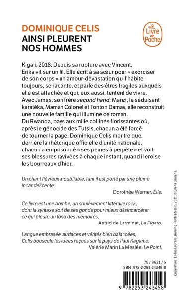 PrésentationKigali, 2018. Depuis sa rupture avec Vincent, Erika vit sur un fil. Elleécrità sa sœur pour« exorciser de son corps» un amour dévastation qui l’habite toujours, se raconte, et parle desêtres fragiles auxquels elle est attachée et qui, eux aussi, tentent de vivre. Avec James, son frère second hand, Manzi, le séduisant karatéka, Maman Colonel et Tonton Damas, elle reconstruit une nouvelle famille qui illumine ce roman. Du Rwanda, pays aux mille collines florissantes où, après le génocide des Tutsis, chacun aété forcé de tourner la page, Dominique Celis montre que, derrière la rhétorique officielle d’unité nationale, chacun a emprisonné« ses peinesà perpète» et voit ses blessures ravivéesà chaque instant, quand il croise les bourreaux d’hier… Un chant fiévreux inoubliable, tant il est porté par une plume incandescente. Dorothée Werner,Elle. Ce livre est une bombe, un soulèvement littéraire rock, dont la syntaxe sort de ses gonds pour mieux désincarcérer ce qui pleure au fond des mémoires. Astrid de Larminat,Le Figaro. Langue embrasée, audaces et vérités bien balancées, Celis bouscule les idées reçues sur le pays de Paul Kagame. Valérie Marin La Meslée,Le Point. Afficher moinsAfficher plus