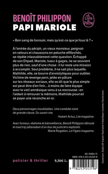 Dans “Papi Mariole”, Benoît Philippon mêle avec brio humour, suspense et tendresse. Un ancien tueur à gages amnésique, Mariole, fait équipe avec une jeune victime de revenge porn, Mathilde. Ensemble, ils se lancent dans un road trip déjanté pour retrouver la mémoire de Mariole et accomplir sa dernière mission. Entre quiproquos, rebondissements et moments émouvants, cette comédie noire vous entraîne dans les péripéties de ce duo improbable. Afficher moinsAfficher plus